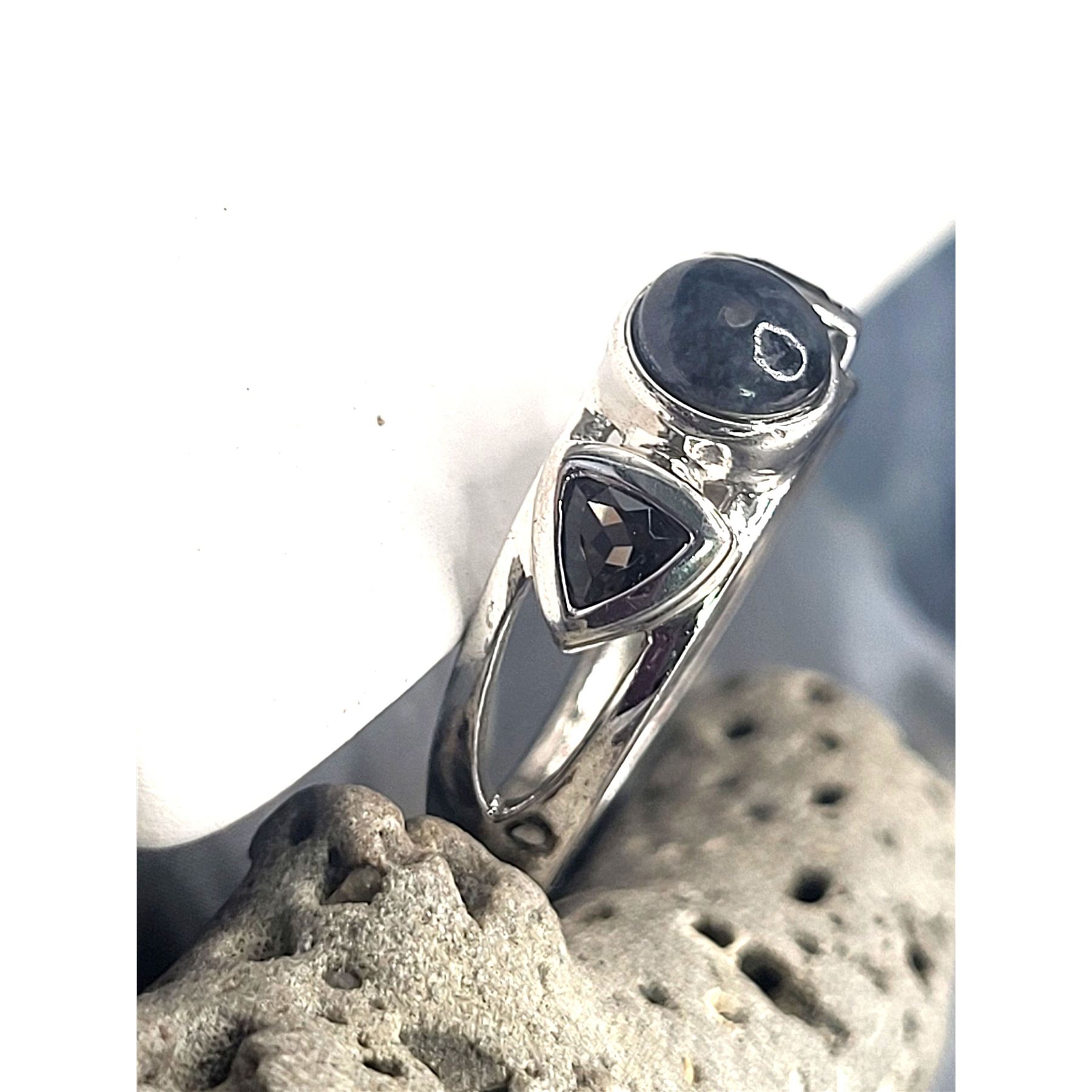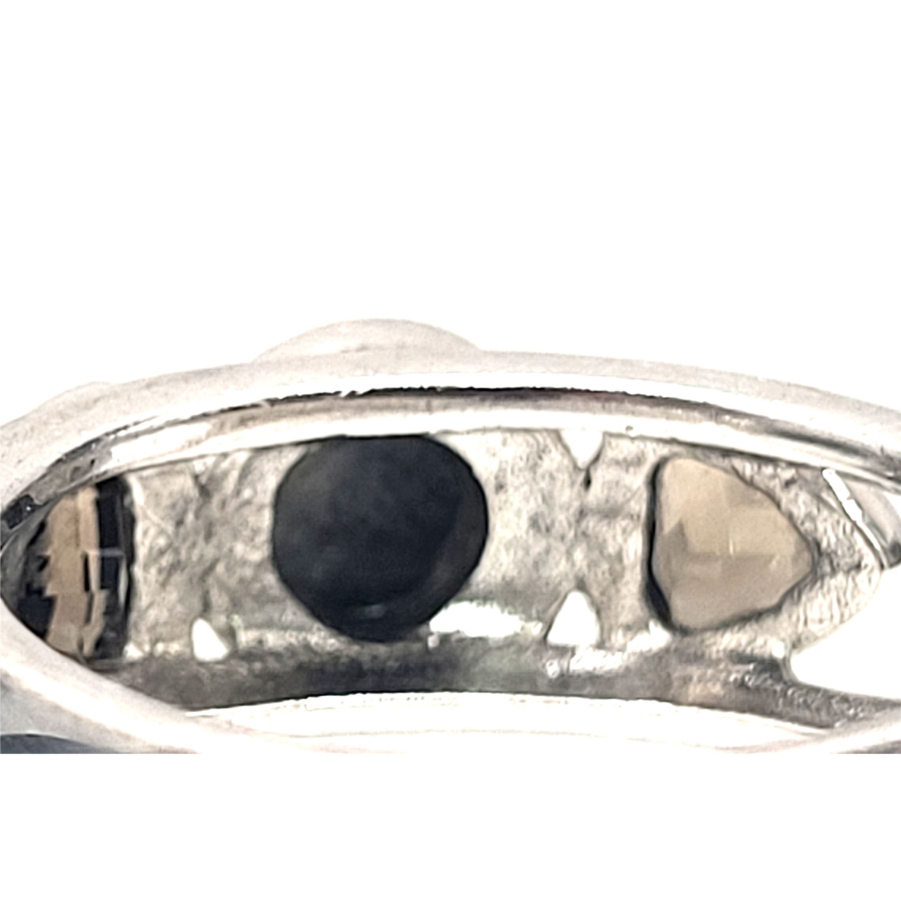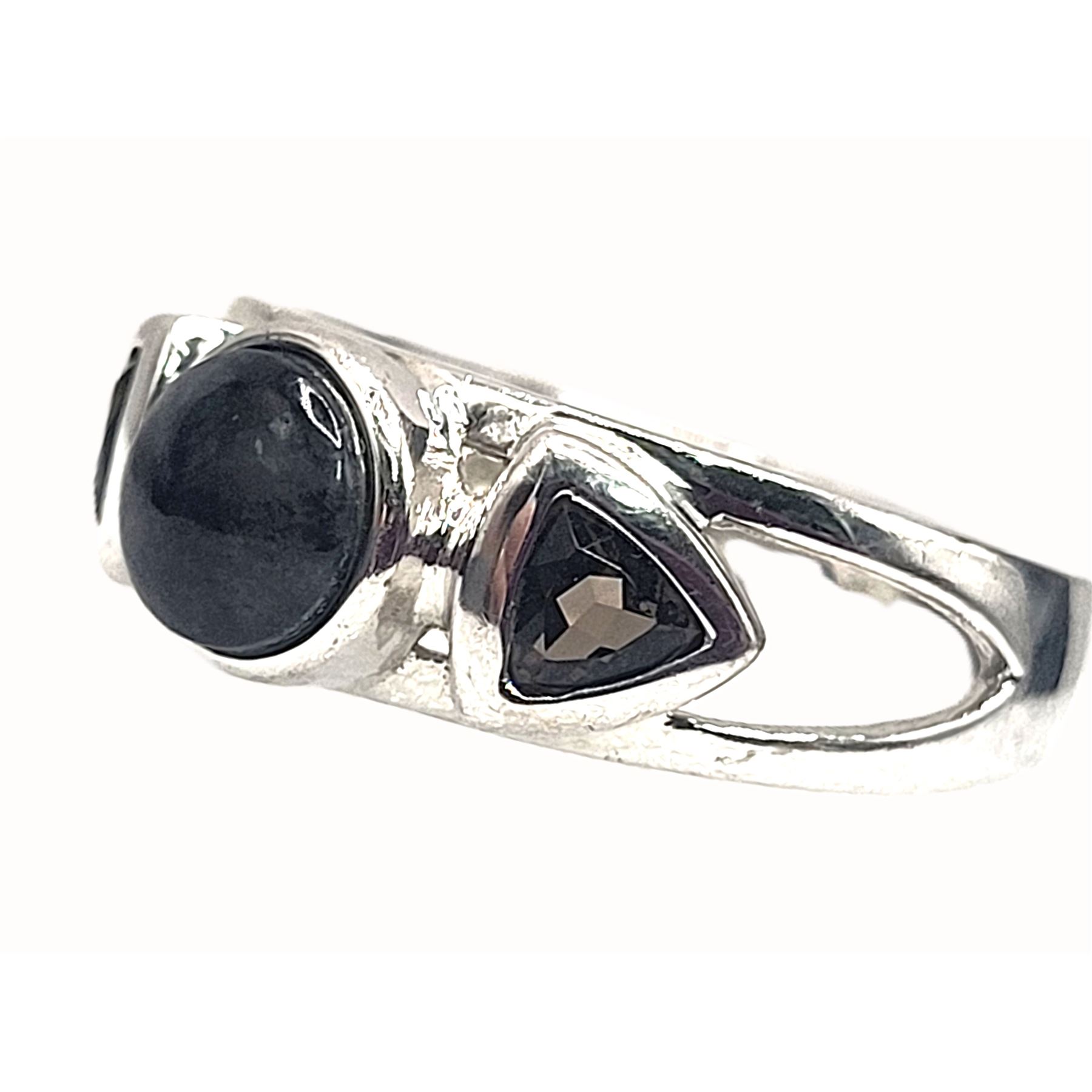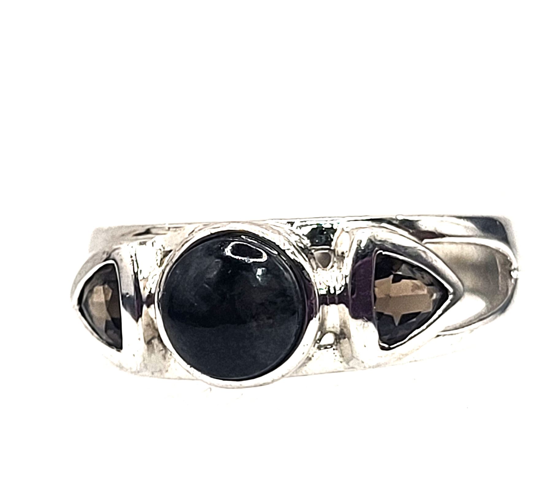 This is a STERLING SILVER ring that features a cabochon center amethyst and trilliant-cut smoky quartz adjacent.& nbsp; The open (split) shoulder design and the bezel-set gemstones make an attractive ring for a man or a woman& nbsp; The ring is US size 9.75 can be sized by a professional jeweler. It does not appear to have a protective finish that would hinder sizing. Admin: KMEL3/lg