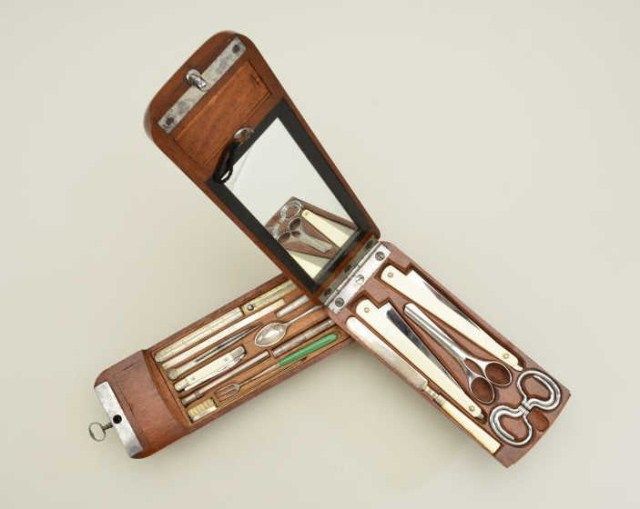 Mans traveling vanity and shaving set in its original hardwood case with mirror in lid and chamois cover. The set contains two razors marked “Sieber”, scissors, thermometer, ruler, tweezers, pen, pencil, tooth brush,small fork, spoon, and a couple other items we could not identify. The accessories are all of high quality and date from the 19th to early 20th century and are in very good plus to near fine condition. The case is alsoextremely well made and the top swings to the side to expose second level of items with key. Est.;$2,000-$4,000.