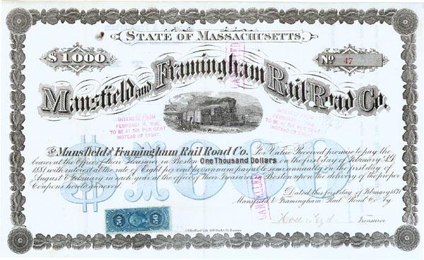 1871, Massachusetts. $1000 bond bearing 6% interest. Black/White with blue overprint. Vignette of small train at center. Stamp and punch cancelled. Very fine.