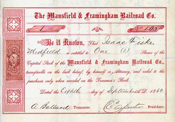 1869. Stock certificate for 1 share. Red. The company was leased to the Boston, Clinton and Fitchburg Railroad for 20 years and ran from Mansfield, Mass. to South Framingham, Mass. Scarce. Uncancelled and Very Fine.
