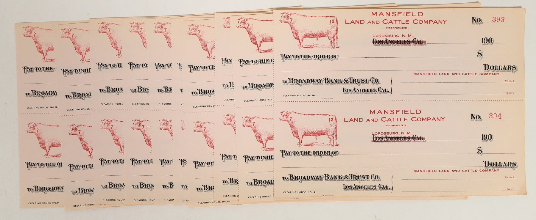 Ten sheets of 2 checks each for the Mansfield Land & Cattle Company. Dateline Lordsburg, New Mexico, 190-. Red and black print on light pink paper with livestock vignette. The Mansfield brothers had a meat business in Los Angeles in 1890 before incorporating this company in 1901. Edward and William Mansfield ran the New Mexico operation with Steins as their base of operation since it was on the Southern Pacific with a direct line to Los Angeles. IN 1913, Edward suspected his brother had been killed by Mexican bandits after he went missing.