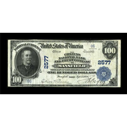 <B>Mansfield, OH</B></I> - $100 1902 Plain Back Fr. 706 <B>The Citizens NB & TC</B></I> Ch. # 2577<BR> This attractive note boasts the second title. This issuer only issued $50s and $100s starting with Series 1882. The signatures are bold and the paper is perfectly original. <B>Very Fine.</B></I><BR><BR><b>Shipping:</b> Coins & Currency (<a target="_blank" href="http://www.heritageauctions.com/common/shipping.php">view shipping information</a>)