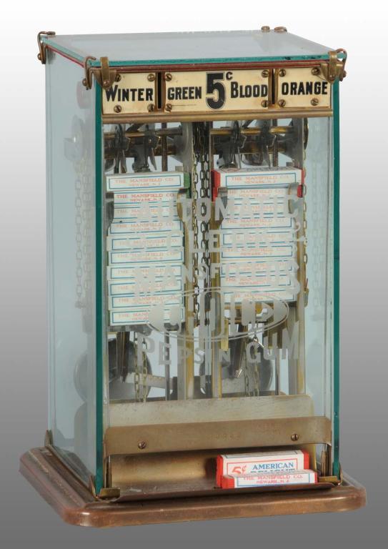 Description Serial number "73,733". Marquee and gum included are reproductions. Edge glass has some chipping and mechanism to lock the base is slightly different than what is usually found with Mansfield dispensers. Condition (Very Good). Size 16" T.