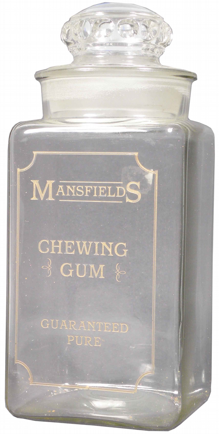 Mansfields Chewing Gum Glass Store Jar. Etched cut glass and gold filled letters with ground glass lid. No chips or cracks. 11 1/2 inches tall.