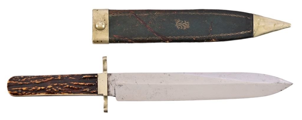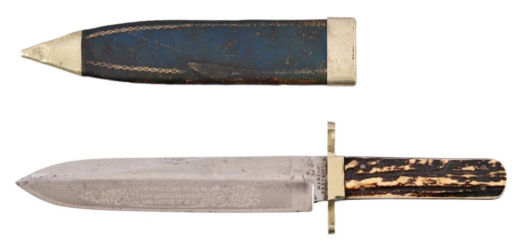 Blade measures 7.75" with etching " The American's Pride, Equal Laws, Equal Rights, And Justice For All." Overall length 12.25". With original sheath