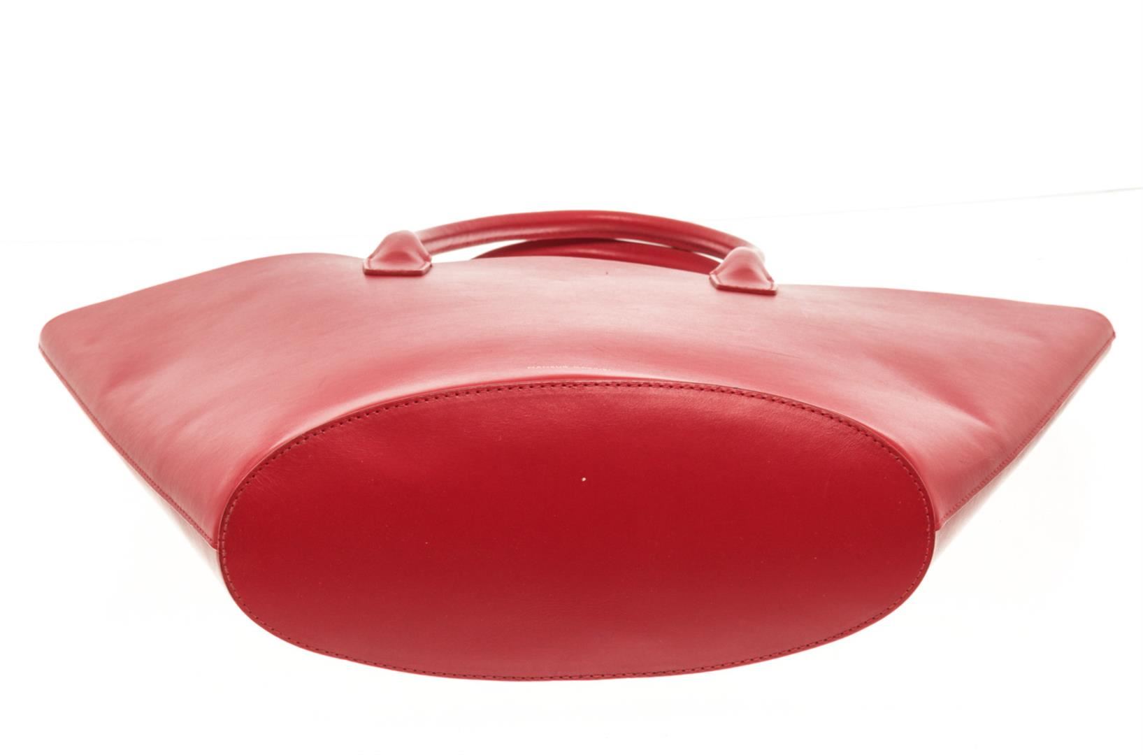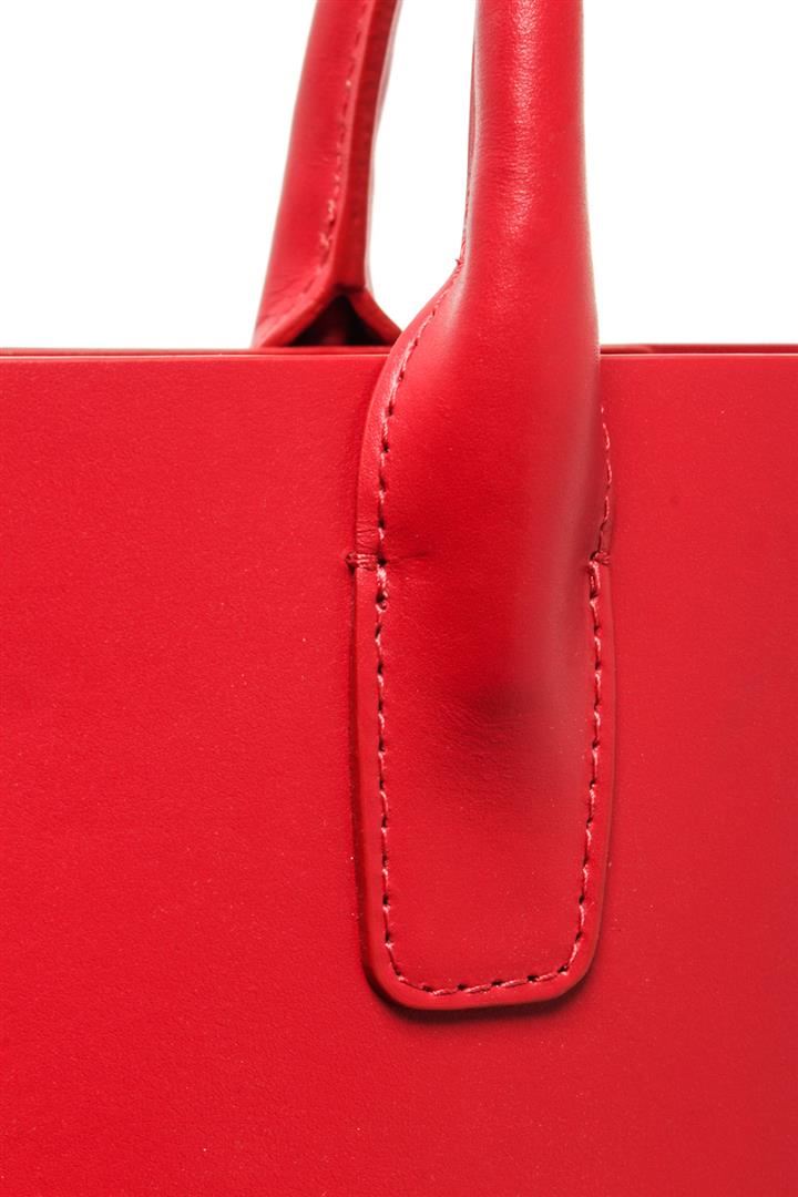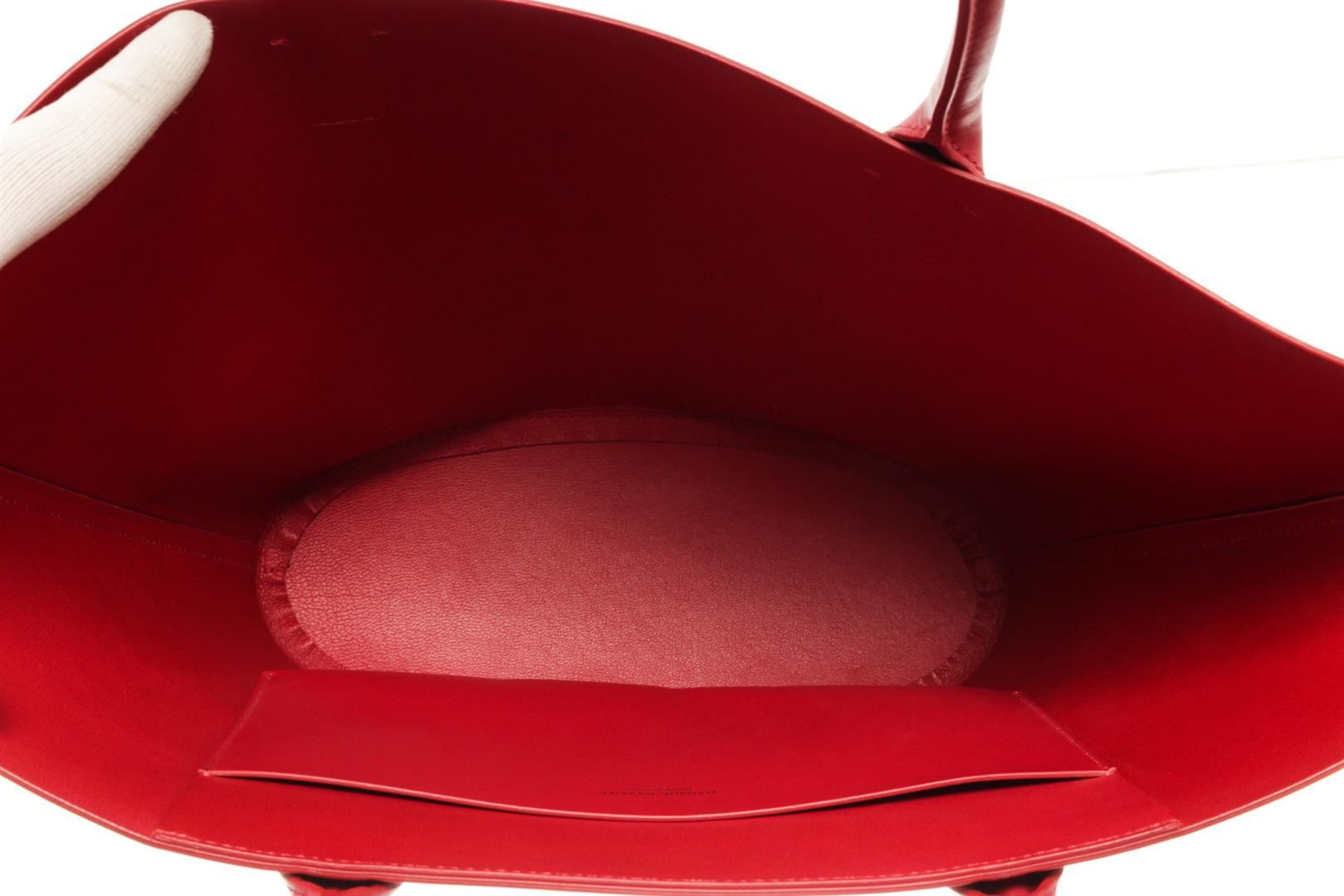 Mansur Gavriel Flamma Calfskin Red Triangle Tote Bag. All available information is listed in the description and shown in the photos. Mansur Gavriel Flamma Calfskin Red Triangle Tote Bag with this mansur gavriel flamma calfskin triangle tote boasts a vibrant red impactful exterior. the structured reverse trapezoid shape uses a thicker smooth calfskin to stay upright, leading into its dual rolled leather top handles for toting in hand, or on shoulder. the open top guides you into a wide open self-lined interior, featuring one floating slip pocket along the back wall. 9.8-18.8"(W) x 11.3"(H) x 4.5"(D) / Handle Drop: 7.5"(top handle) / 47.7 x 28.70 x 11.43 Cm