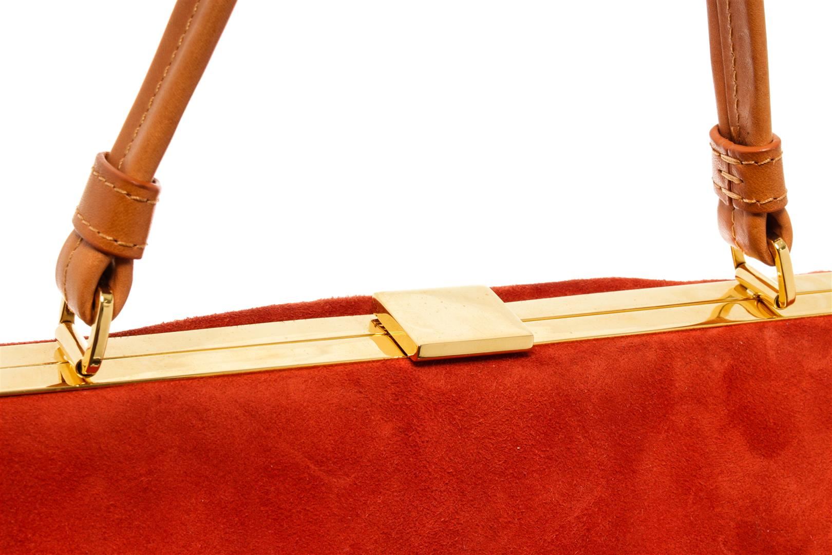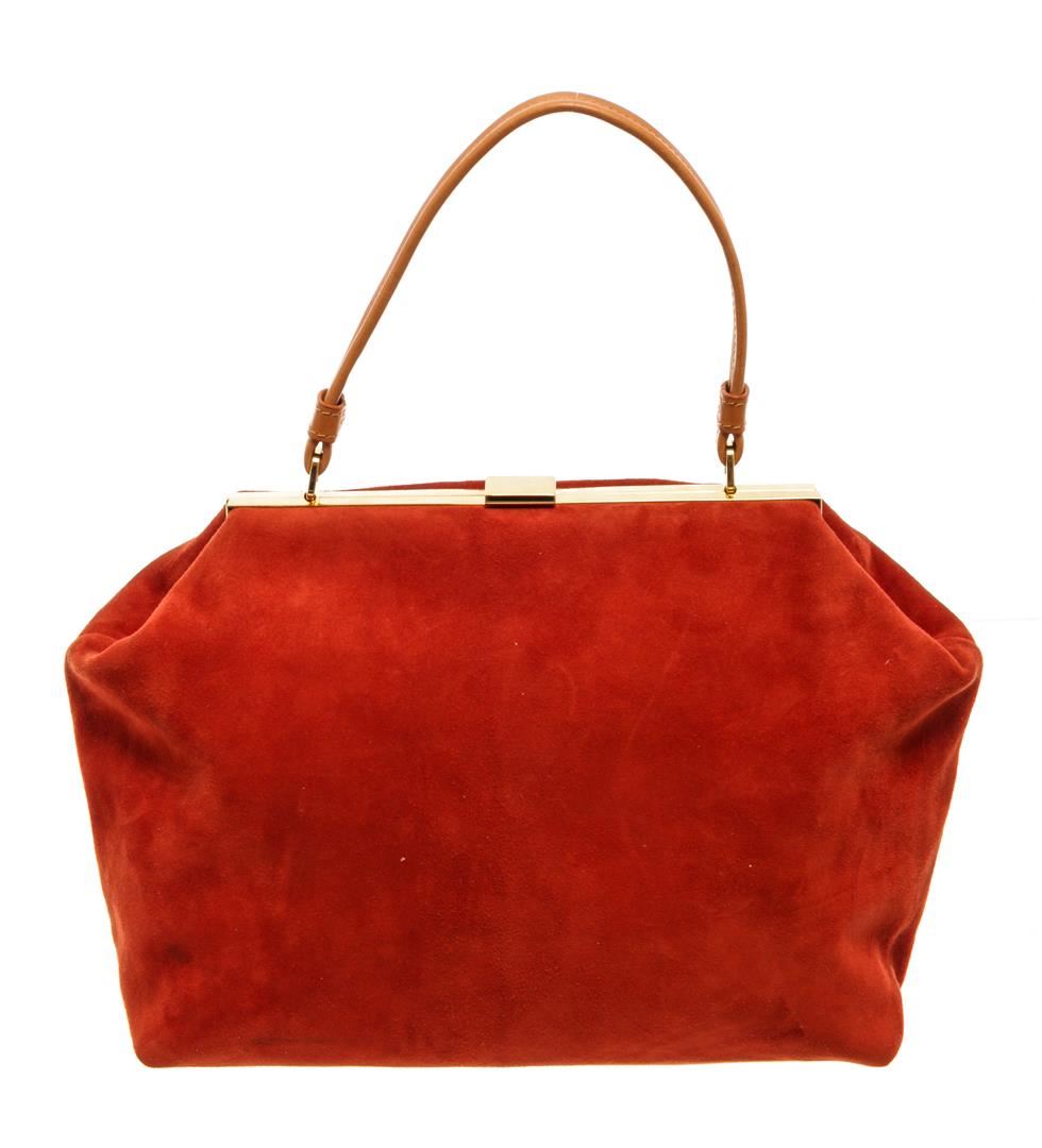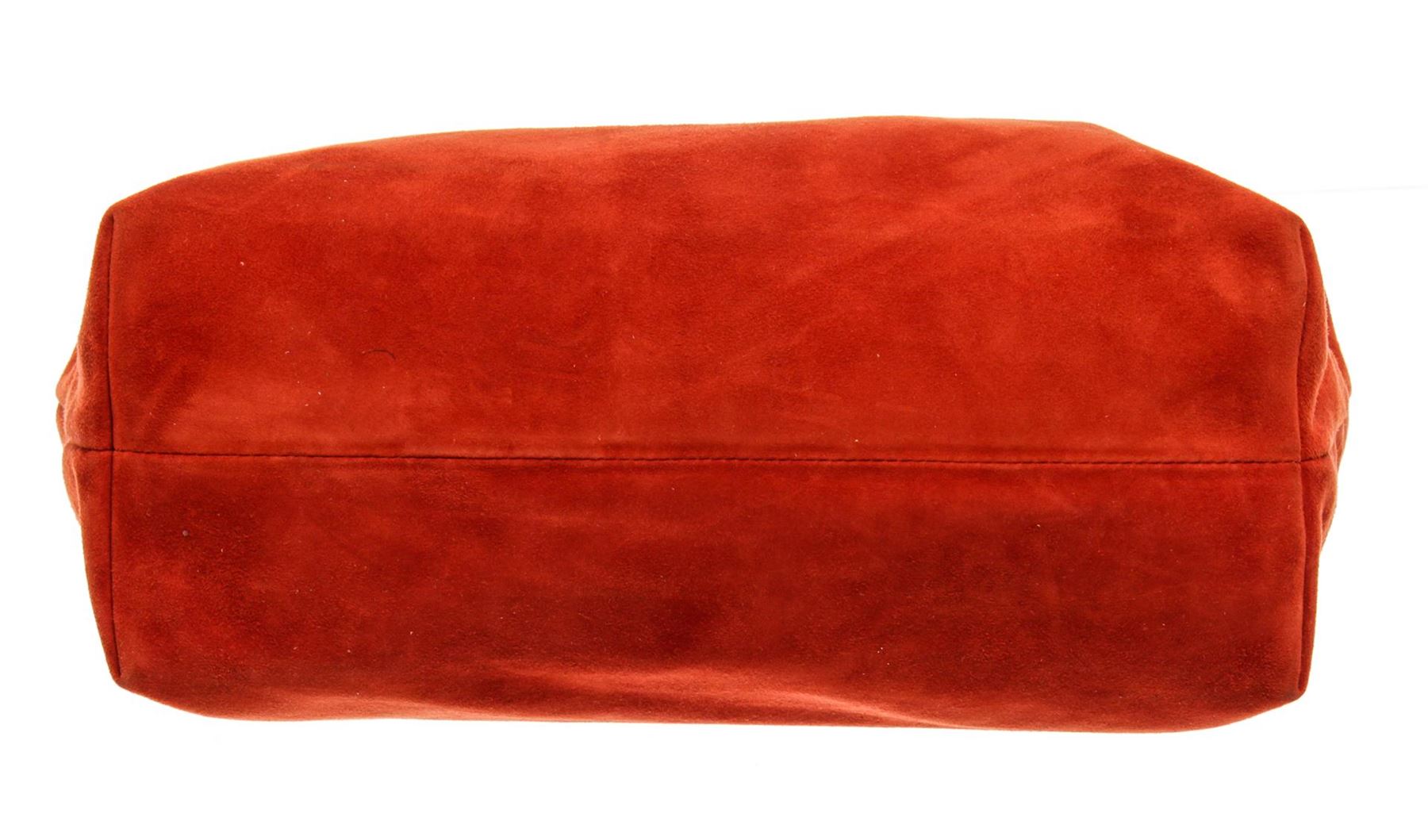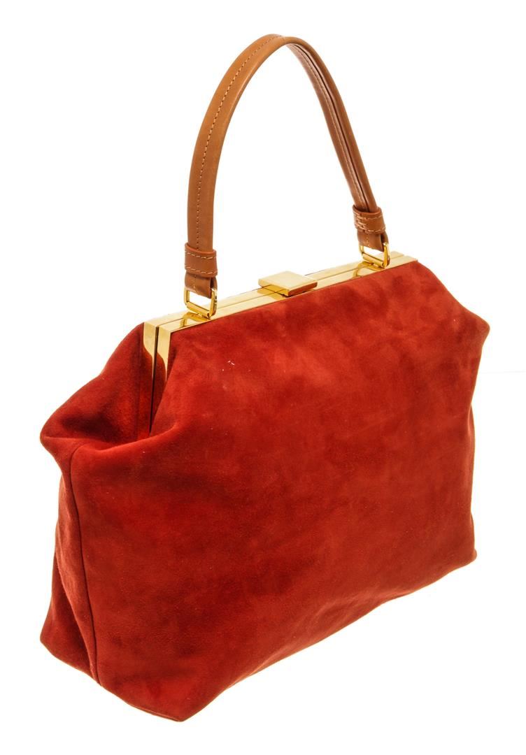 Mansur Gavriel Red Suede Soft Elegant Handbag. All available information is listed in the description and shown in the photos. Mansur Gavriel Red Suede Soft Elegant Handbag with gold-tone hardware, red suede lining, interior slip pocket, single leather top handle, and pushlock closure at the top. .