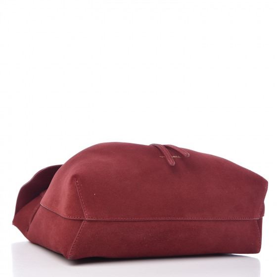 Details: Rococo shoulder tote is crafted of burgundy leather. The bag features a flat leather top handles, and a optional shoulder strap with gold hardware. The top flap opens to a beige canvas interior with blue leather trim and patch pocket.