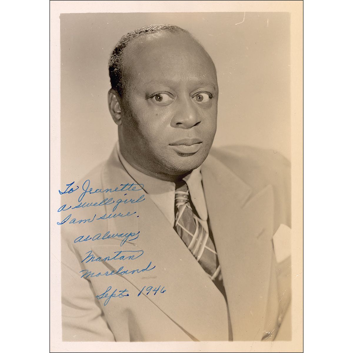 Talented and prolific character actor (1902–1973) with great comic timing who appeared in hundreds of films, best remembered as Birmingham Brown, Charlie Chan’s chauffeur in a number of films. Vintage glossy 5 x 7 photo, signed and inscribed in fountain pen “To Jeanette, a swell girl I am sure, as always, Mantan Moreland, Sept 1946.” In very good condition, with scattered surface marks and impressions, and noticeable creasing to right edge, not affecting signature.
