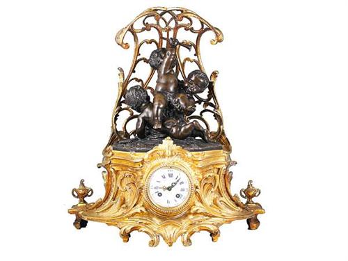 Neo-rococo, gilt and cast bronze case with patina. 1/2 striking, spindle escapement. Damaged enamelled face with Roman numerals. French, circa 1860 Size: 51 cm