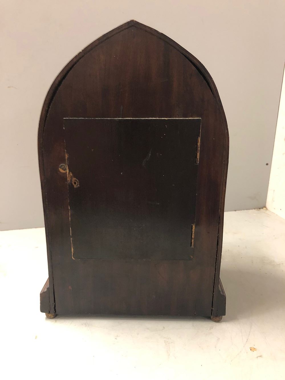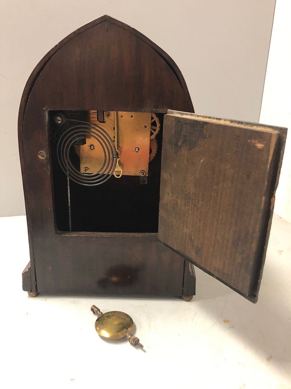 Mantel Clock with inlaid case, silver dial, all original and in running condition. From the Chatham, Ma, Cape Cod Collection.