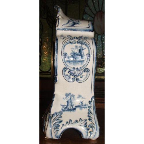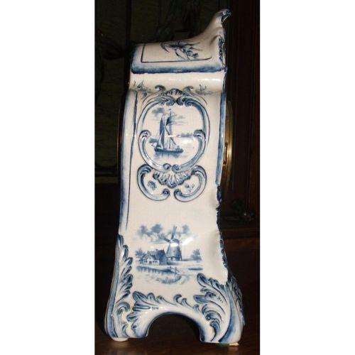 Unsigned. Early 20th century. Painted porcelain. Nice shelf clock with a blue on white painted floral scroll case depicting a Dutch landscape, and a gilt trimmed dial. 12" high