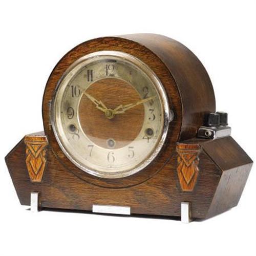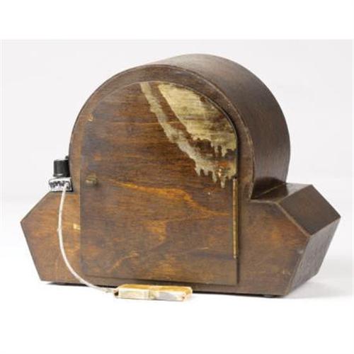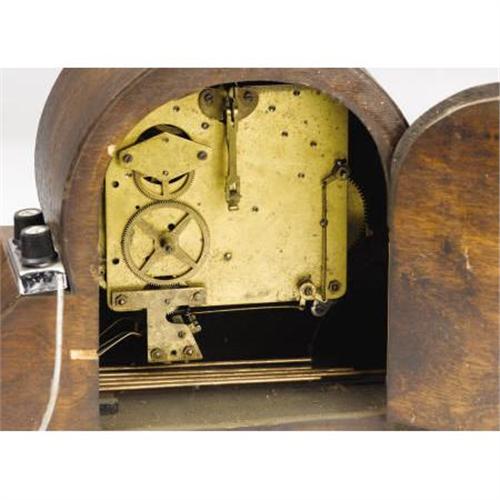 <B>Mantel Clock</B></I><BR>A mantel clock in a dark wood case with Arabic numerals. Glass front opens and back opens to reveal the pendulum. Equipped to chime.<BR>Sticker to verso: <I>2241</B></I><BR>9 inches high x 11.75 inches wide <BR> <BR><BR><b>Shipping:</b> Requires 3rd Party Shipping (<a target="_blank" href="http://www.heritageauctions.com/common/shipping.php">view shipping information</a>)