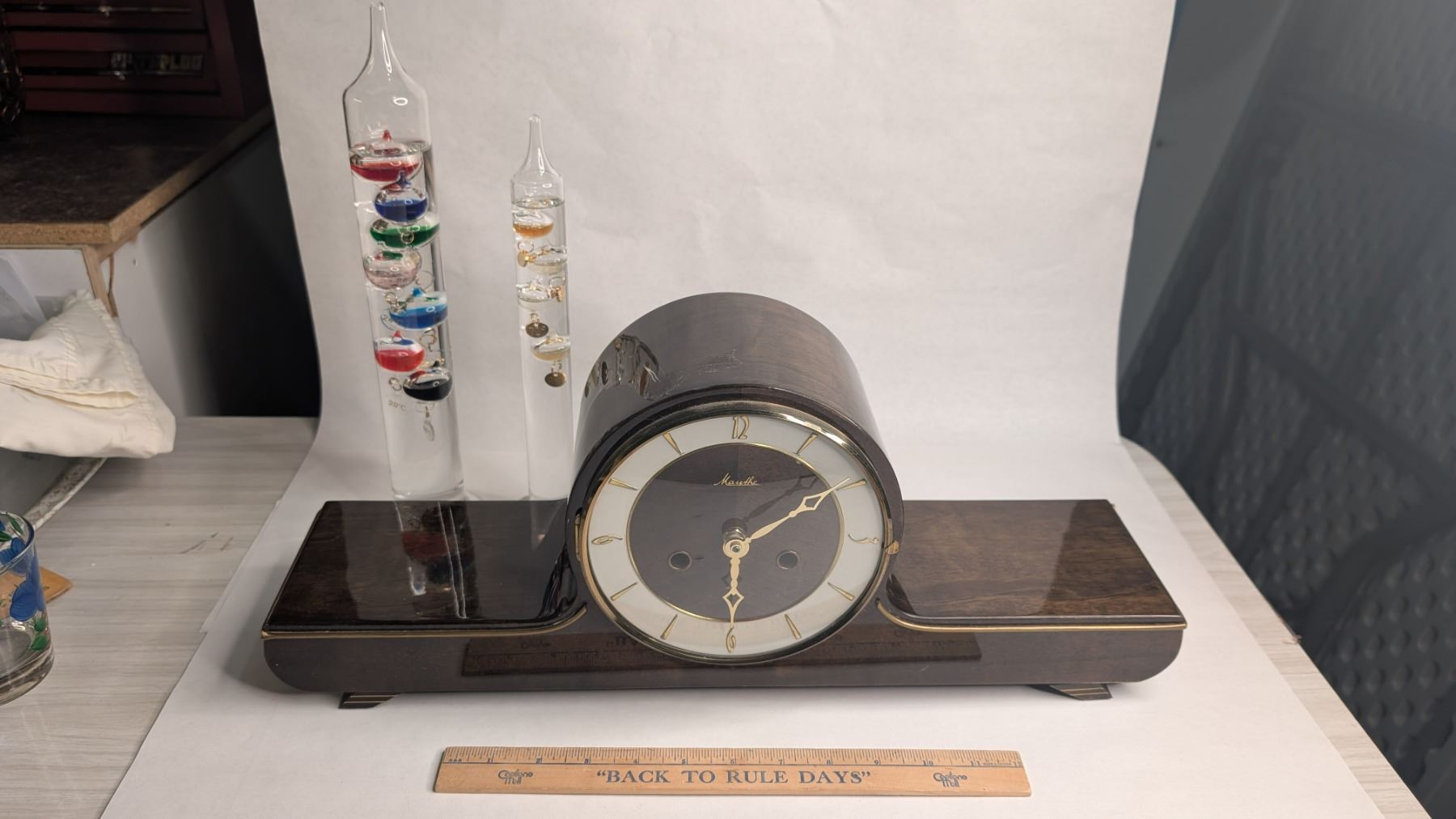 Mantle Clock (movement is missing) & Galliano Thermometers