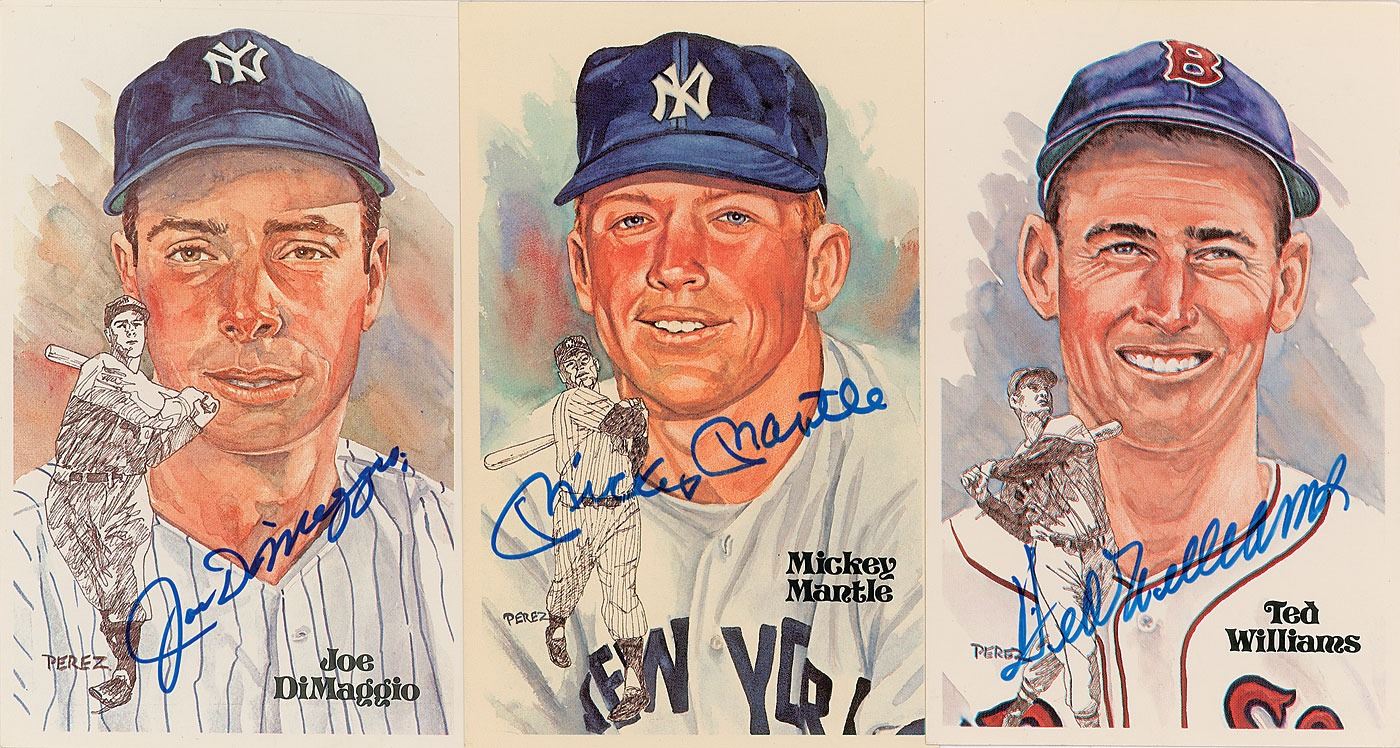 Set of three color Perez–Steele postcards of Mickey Mantle, Joe DiMaggio, and Ted Williams, each 3.5 x 5.5, individually signed in blue felt tip by the pictured ballplayer. In overall fine condition.