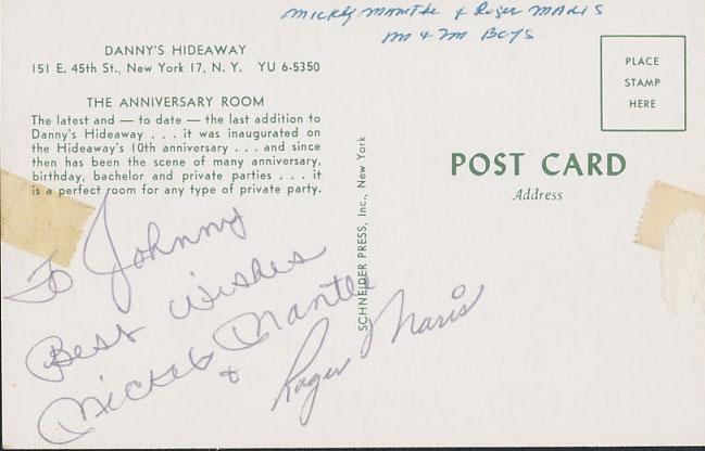 Vintage Mickey Mantle and Roger Maris signed and inscribed postcard from ''Danny's Hideaway'' New York City restaurant. Inscription by Mantle reads, ''To Johnny / Best Wishes / Mickey Mantle &'' then signed, ''Roger Maris''. Signed by both men in black ink. Postcard, measuring 5.5'' x 3.5'', has some light tape residue, else near fine. Includes JSA COA.