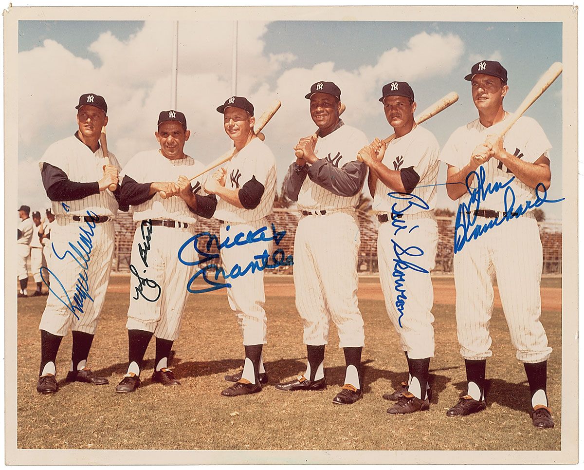 Color satin-finish 10 x 8 photo of the Yankees sluggers posing with bats on their shoulders, signed in blue and black felt tip by Mickey Mantle, Roger Maris, Yogi Berra, Bill Skowron, and Johnny Blanchard. Small tack hole tears and creasing to the upper corners, otherwise fine condition.