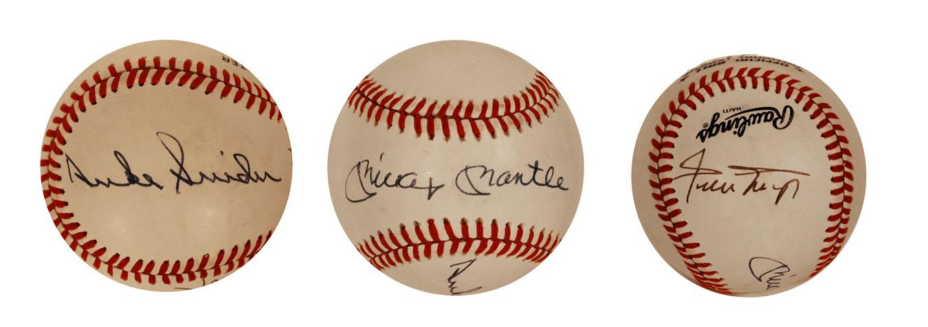 Ball signed by baseball greats Willie Mays, Duke Snider and Mickey Mantle, whose signature graces the sweet spot. Official American League Rawling's baseball with printed signature of presiding Commissioner, A. Bartlett Giamatti. With PSA/DNA COA. Near mint condition.