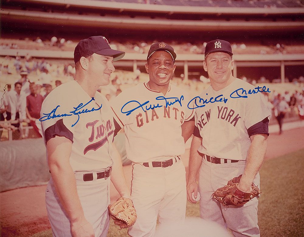Color glossy 13.75 x 11 photo of the three Hall of Famers posing together in their uniforms, signed in blue felt tip by Mickey Mantle, Willie Mays, and Harmon Killebrew. In fine condition.