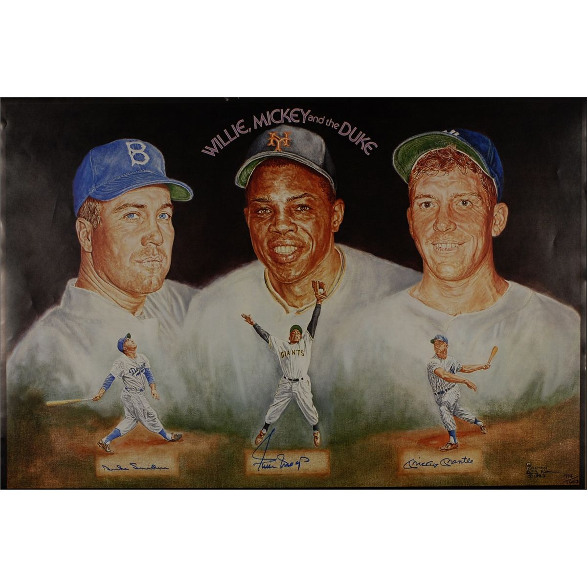 Color limited edition 36 x 24 composite print entitled ‘Willie, Mickey and the Duke,’ numbered #714/1603, signed in blue felt tip by Mickey Mantle, Willie Mays, and Duke Snider. Also signed in blue felt tip by the artist, David Millman. In fine condition, with scattered small bends and light creases.