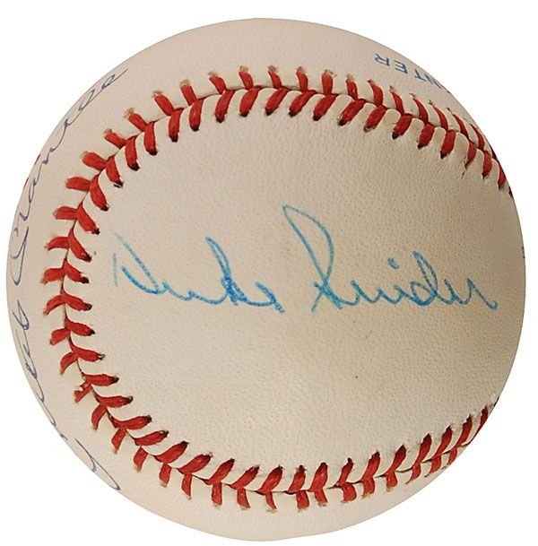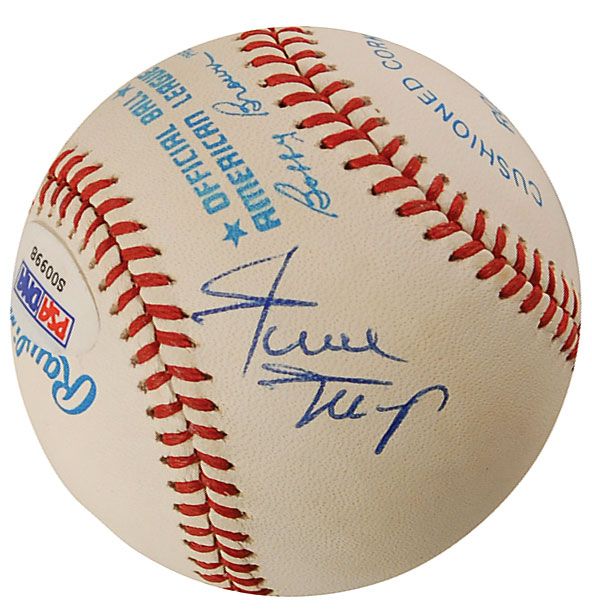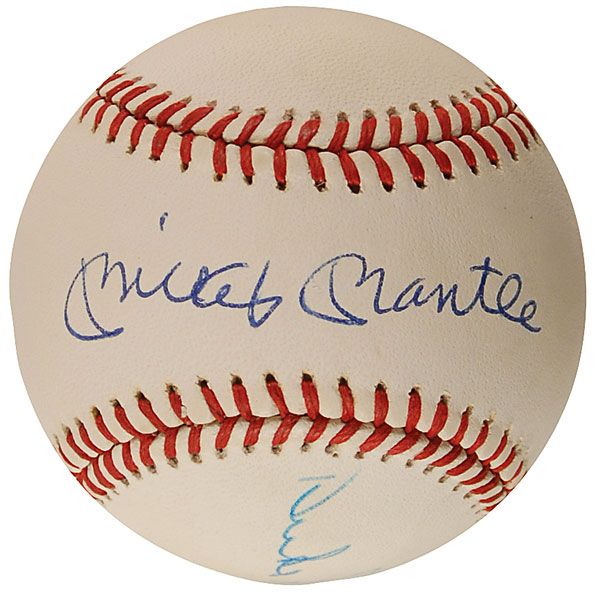 Official Rawlings American League baseball signed in blue ballpoint on the sweet spot by Mickey Mantle and on the side panels by Willie Mays and Duke Snider. In fine condition, with a PSA/DNA label affixed to a side panel. Accompanied by a full letter of authenticity from PSA/DNA.