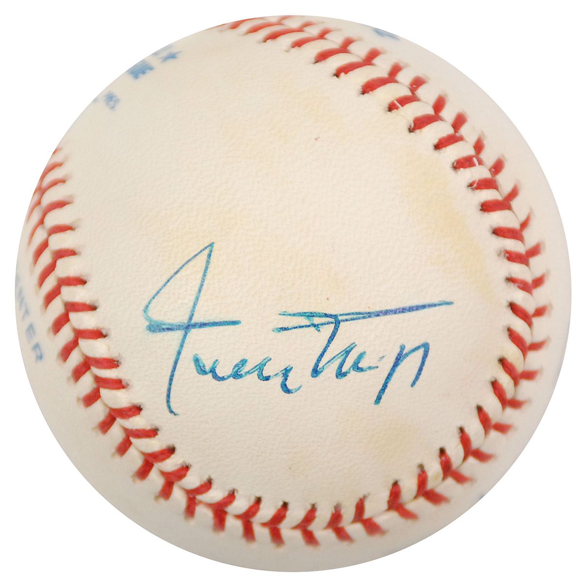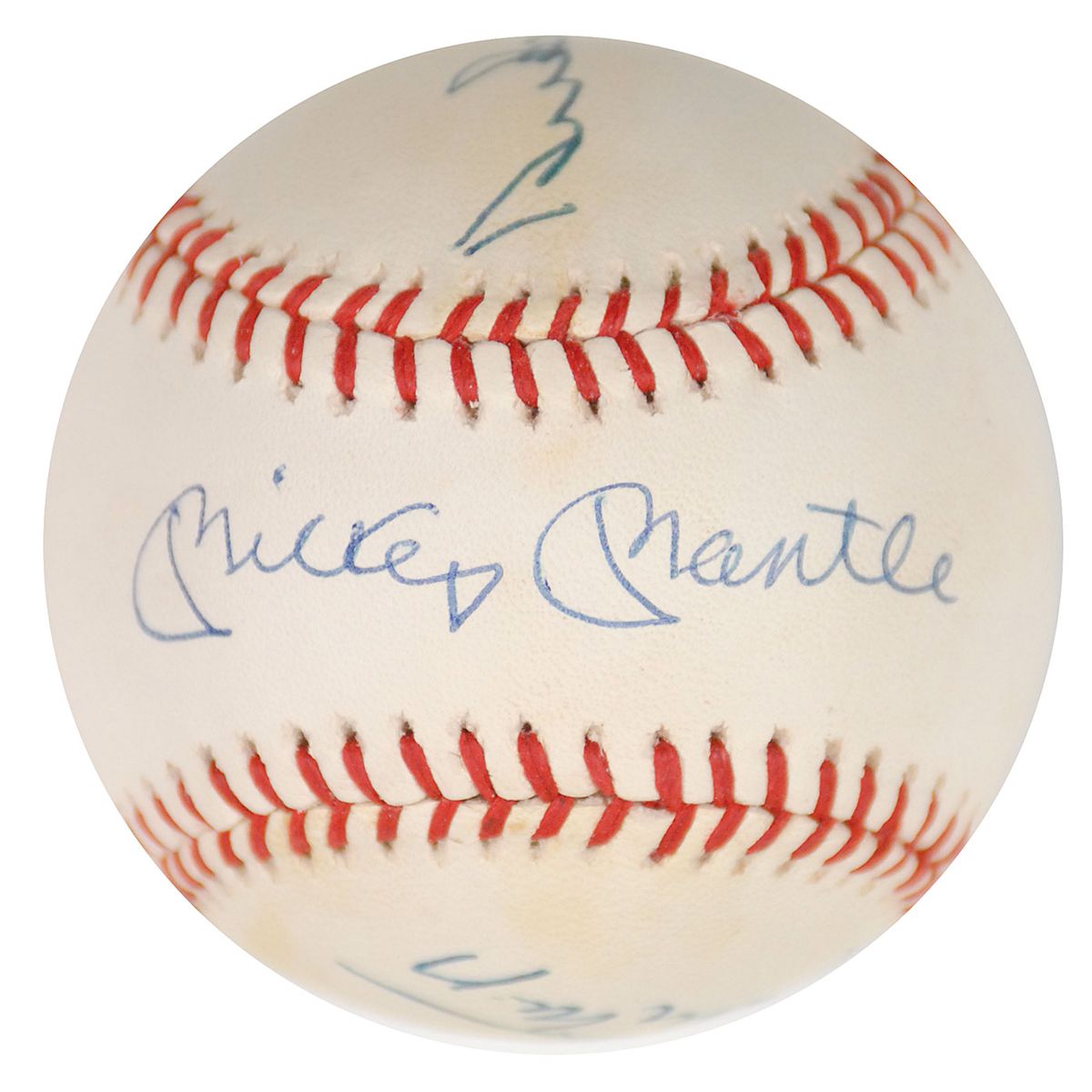 Official Rawlings American League baseball signed in blue ballpoint on the sweet spot by Mickey Mantle and on the side panels by Willie Mays and Duke Snider. Toning to the Mays and Snider panels, otherwise fine condition. A desirable combination of the three great New York outfielders.