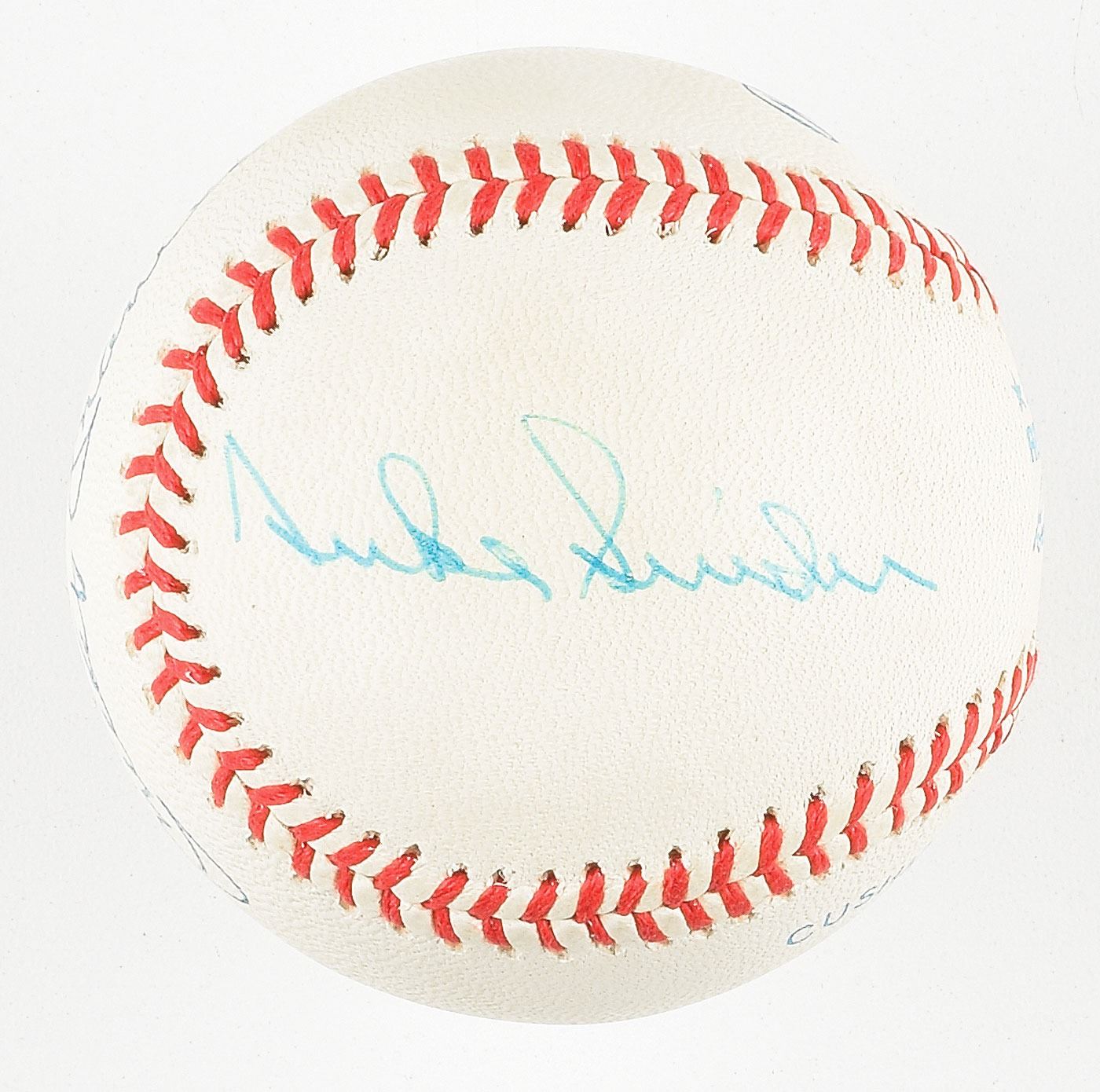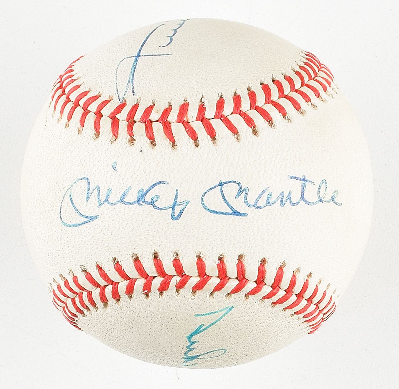 Official Rawlings American League (Brown) baseball signed in blue ballpoint on the sweet spot by Mickey Mantle, on the upper panel by Willie Mays, and on the lower panel by Duke Snider. In fine condition, with subtle toning. A desirable example boasting the legendary trio of New York outfielders.