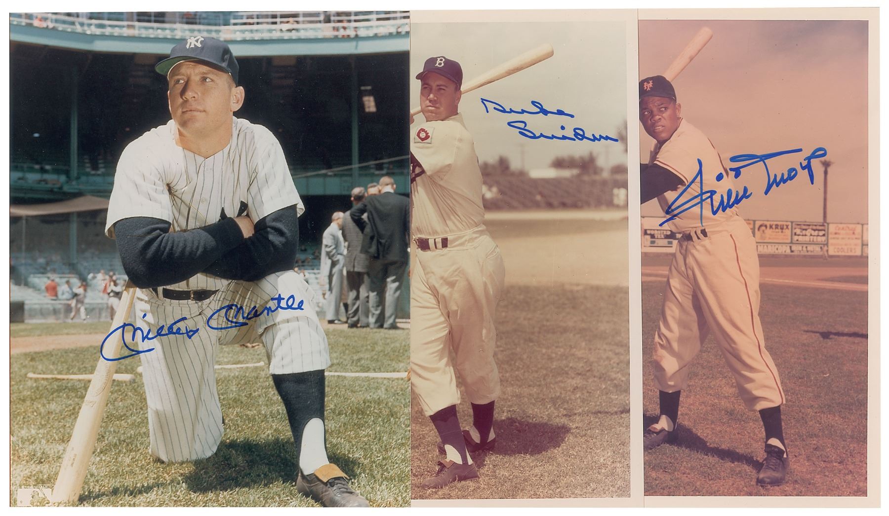 Three color 8 x 10 photos of Mickey Mantle, Willie Mays, and Duke Snider, individually signed in blue felt tip by the Hall of Fame New York outfielders. In fine condition.