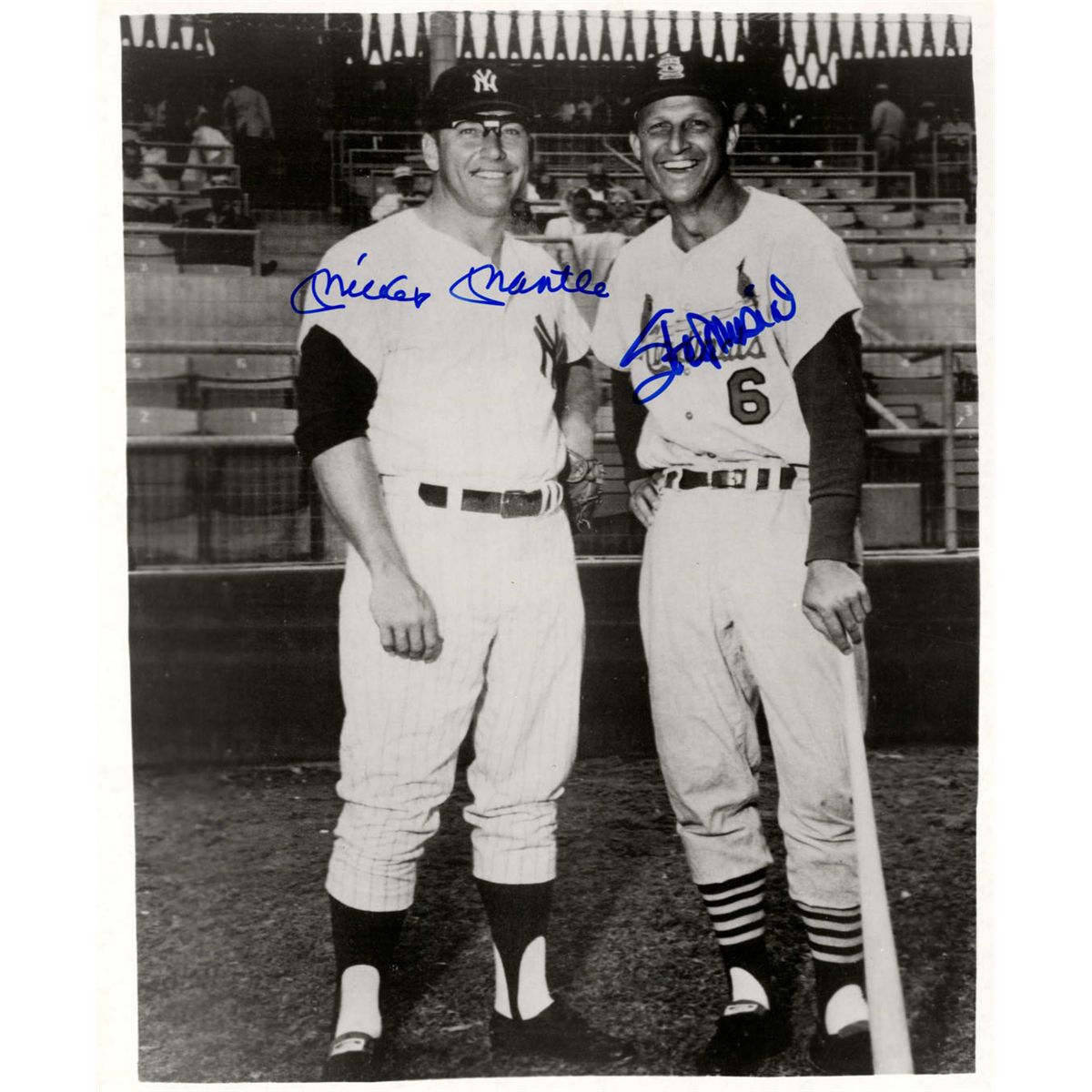 Mickey Mantle and Stan Musial signed 8'' x 10'' glossy photo. Famed New York Yankees switch hitter signs ''Mickey Mantle'' in blue marker and the St. Louis Cardinals MVP signs ''Stan Musial'' across the uniform bearing his number 6. Near fine.