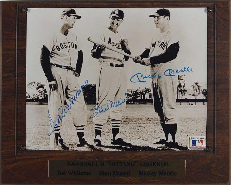 Glossy 10 x 8 photo of Ted Williams, Stan Musial, and Mickey Mantle, gathered around Mantle’s bat on the field. Signed in blue felt tip by all three. Presented on a wooden plaque display behind Lucite to an overall size of 11.5 x 10.5. In fine condition, with a 1988 Major League Baseball sticker affixed to bottom right. Pre-certified Steve Grad/PSA/DNA and RRAuction COA.