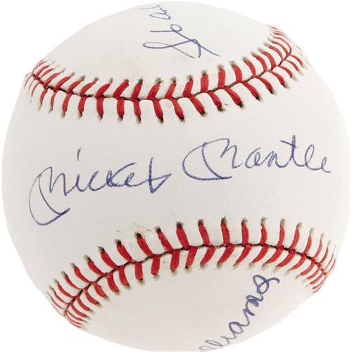 <B>Mickey Mantle, Ted Williams & Hank Aaron Signed Baseball.</B></I> Both the signatures and the signers themselves are about as good as it gets on this ONL (White) ball, bearing a holographic authenticating sticker from the Mickey Mantle Museum. The Mick's 10/10 blue ink sweet spot signature is framed by Hammerin' Hank above and Teddy Ballgame below. That's some real home run power! Those who treasure pristine condition in their collections will want to bid aggressively on this piece. <I>LOA from PSA/DNA.</B></I>