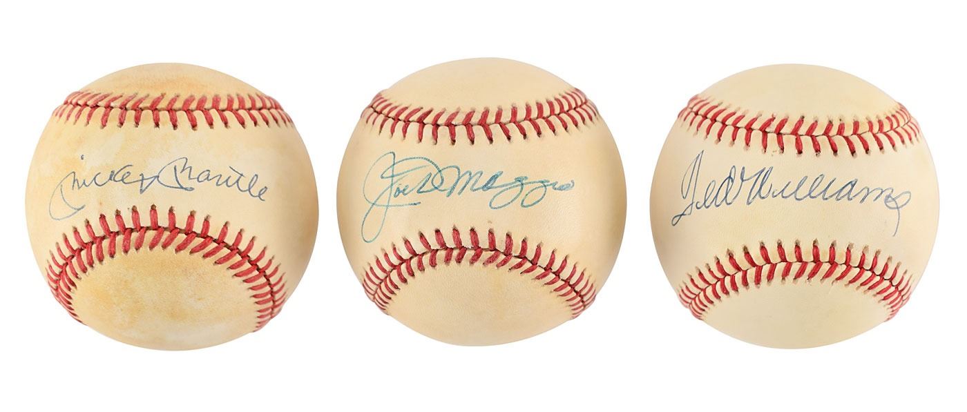 Group of three official Rawlings American League (Brown) baseballs, individually signed on the sweet spot in blue or black ballpoint by Mickey Mantle, Ted Williams, and Joe DiMaggio. In overall very good to fine condition, with toning and light staining, heaviest to the Mantle ball.