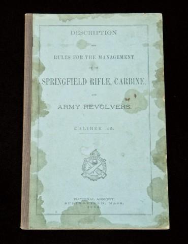Manual entitled “Rules for the Management of the Springfield Rifle, Carbine, and Army revolvers, caliber .45, National Armory, Springfield, Mass. 1882”. The manual illustrates the internal parts of Springfield trapdoors, accessories, officer’s model, and shows both Colt Single Action and Sheffield with complete details on these arms. The manual is in good condition with staining on the cover, in good binding, inside pages very good, and all foldouts present. Est: $300 - $600