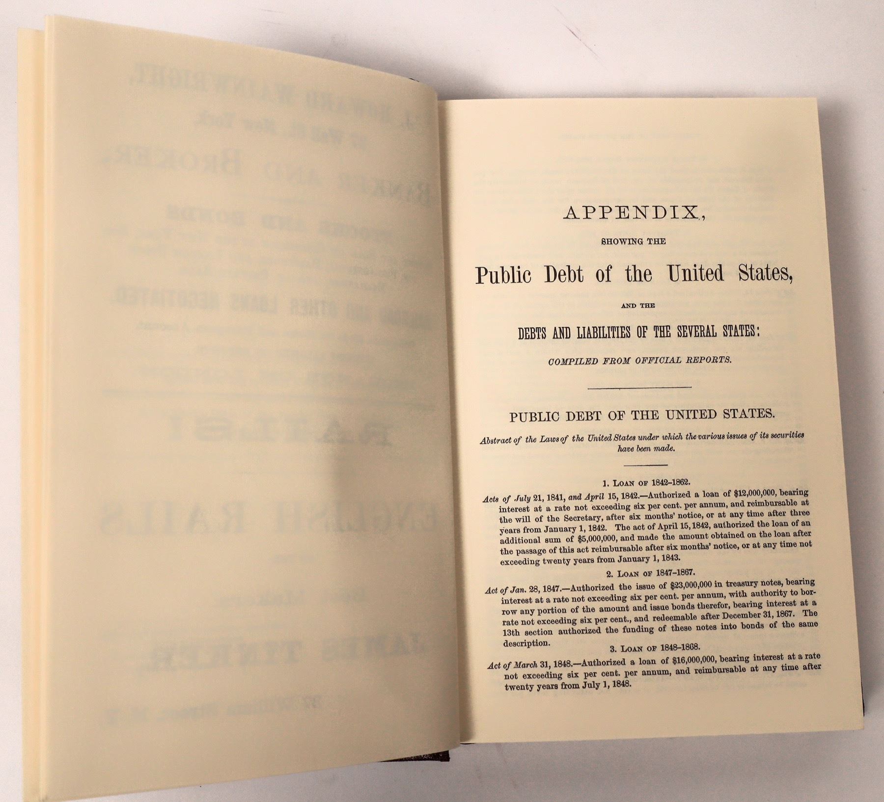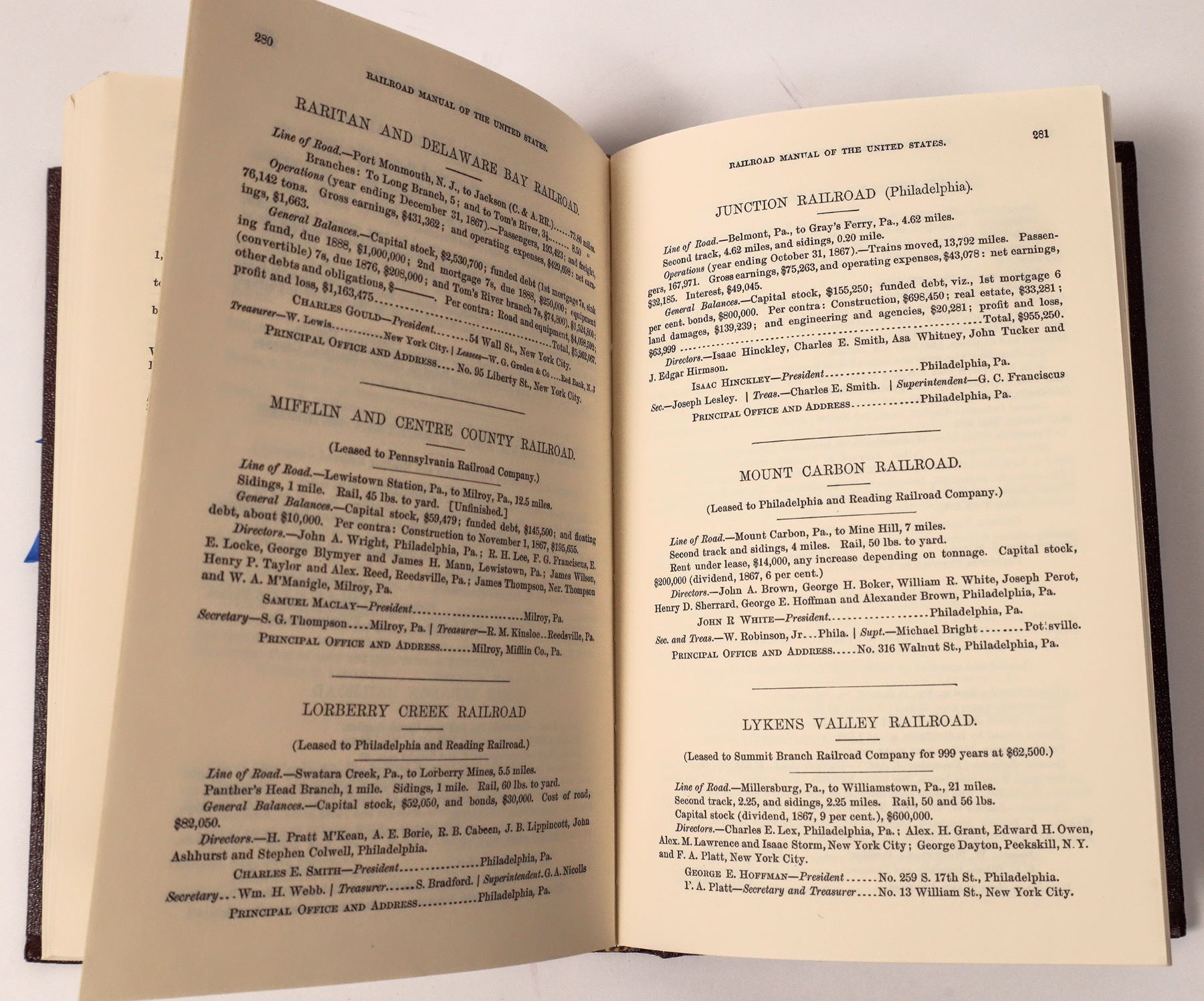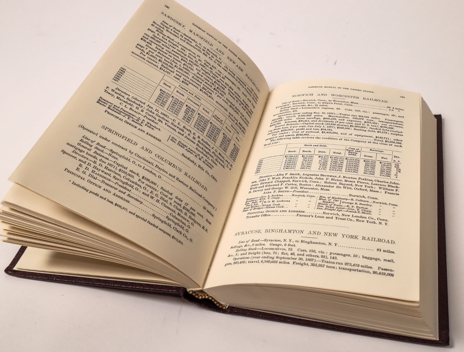 Reprint of the Manual of the Railroads of the United States, for 1868-69, Showing Their Mileage, Stocks, Bonds, Costs, Earnings, Expenses, and Organizations; with a Sketch of Their Rise, Progress, Influences, Etc., together with an Appendix containing Full Analysis of the Debts of the United States, and of the Several States. By Henry V. Poor. 444 pages. 5.75 x 8.75 inches. Excellent condition.