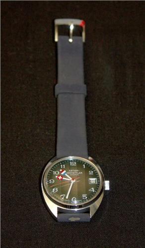Montre-bracelet à remontage manuel avec calendrier et seconde au centre, signée ASTIER-HOSTETTLER GENEVE, curiosité, écusson franco-suisse sur les aiguilles, années 1970