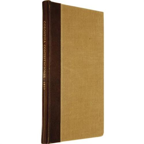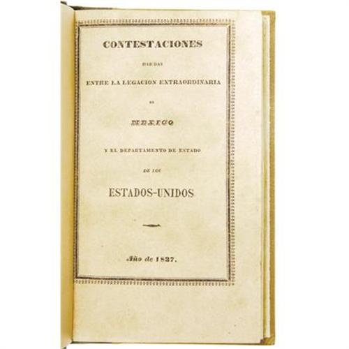<B>Manuel Eduardo de Gorostiza:</B></I><B><I> Correspondencia Que Ha Mediado Entre La Legacion Extraordinaria De Mexico Y El Departamento De Estados Unidos Sobre El Paso Del Sabina Por Las Tropas Que Mandaba El General Gaines.</B></I></B></I> Translated title:<I> "Correspondence of Mediation Between The Special Envoy Of Mexico and The Department of the United States about crossing the Sabine River By The Troops Commanded By General Gaines". </B></I>(Mexico: Reimpreso por Jose M. F. de Lara, Calle de la Palma numero 4<I>, </B></I>1827.) 122 pp. Large Octavo. First edition with printed paper wrappers. Wrapper title: <I>Contestaciones Habidas entre la Legacion Extraordinaria de Mexico y el Departamento de Estado de los Estados-Unidos. Ano de 1837</B></I>. Translated title: Answers Had between the Special Envoy of Mexico and the State Department of the United States. Year of 1837. On verso of back wrapper is vignette of arms of Mexico and below: <I>Impreso por J.M.F. de Lara</B></I>. <BR><BR>Written and published by Manuel Eduardo de Gorostiza, special envoy of Mexico to the United States, this pamphlet contains a 21-page introduction attacking the good faith of the United States in sending its troops across the Sabine as far as Nacogdoches. Gorostiza's commentary was bitterly resented in Washington and fuel was added to the flames when the diatribe was republished in Mexico, early in 1837. The reprint led to a rapid deterioration of diplomatic relations with Mexico which did not resume until 1839, following a renouncement of the inflammatory comments made by Gorostiza by the then-serving Mexican special envoy to Washington. A most important pamphlet attacking the good faith of the U.S. in sending Gaines across the Sabine to occupy Nacogdoches. Brown half-leather with tan canvas boards, gilt-lettered spine. In fine condition. <I>From the collection of Darrel Brown.</B></I><BR><BR><B>Reference:</B></I> Streeter 1220A. Raines, p. 95. Sabin 16908.<BR><BR><b>Shipping:</b> Books & Catalogs (<a target="_blank" href="http://www.heritageauctions.com/common/shipping.php">view shipping information</a>)