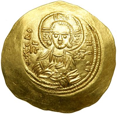 Manuel I, 1143-1180. Gold hyperpyron (4.1 g). Mint of Constantinople. Bust of Christ facing, beardless, wearing nimbus and holding scroll. Reverse: Manuel stg. facing, wearing crown, divitision and chlamys, and holding labarum and globus surmounted by patriarchal cross. S-1956. Extremely Fine.