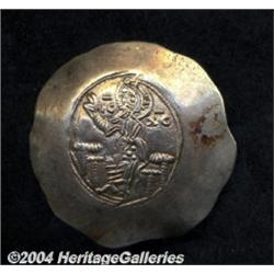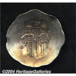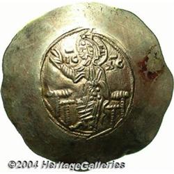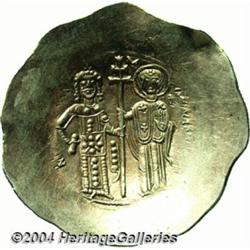 <B>Manuel I.</B></I> 1143-1180. EL aspron trachy (34 mm, 4.45 g). Constantinople, 1152-67(?). Christ enthroned facing, raising right hand in benediction and holding Gospels / Manuel and the Virgin standing facing, holding patriarchal cross between them. DOC 3; Hendy pl. 13, 3-4; SB 1958. XF. <BR><I>From the Geneva Collection.</B></I> <BR><BR><B>Important notice:</B> Heritage usually auctions material at the rate of 200-250 lots per hour. On some occasions eBay Live bid software or the Internet may not be able to keep up with the pace of the auction. We recommend placing a realistic absentee bid now as insurance to avoid disappointment. Occasionally the auctioneer may eliminate or reject an eBay Live bid, and the auctioneer may also reopen a lot after the close of the eBay live bidding (usually because we missed an audience bid), and may reject your bid even if it shows you as the winning bidder. By bidding via eBay Live, you agree that Heritage may award the lot to another bidder at its sole discretion under the circumstances described above or any other reasonable circumstances. Since eBay bids are not shown to us until we open the lot on the floor, we treat those bids just like floor bids. In most cases the floor responds before the eBay bid is presented to us, due to Internet lag time, so for consistency we have made it a policy that floor bids are always considered first over tie eBay live bids. Also please note that all Heritage lots purchased through eBay Live carry a 20% Buyer's Premium. Please make sure you read the Terms and Conditions before you bid.