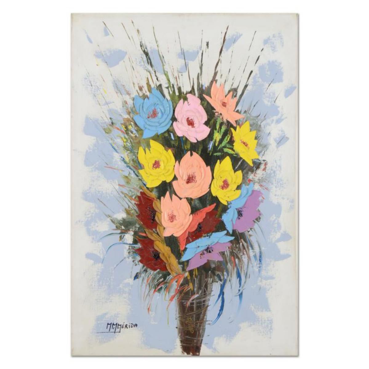 This is an original oil painting on stretched canvas by Manuel Munoz Merida (1920-2010), hand signed by the artist. Includes Certificate of Authenticity. Measures approx. 24" x 36" (image). Due to the age of this piece and the way it was stored, there are minor sings of wear, particularly on the corners and edges. Reference #: 222148