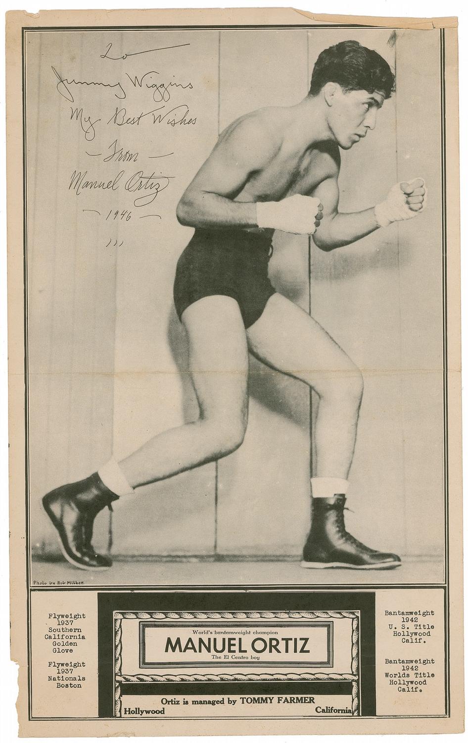 American boxer (1916-1970) of the 1940s who was inducted into the International Boxing Hall of Fame in 1996. Vintage 11 x 17.5 heavyweight paperstock publicity photo, signed and inscribed in black ink “To Jimmy Wiggins, My best from Manuel Ortiz 1946.” In very good condition, with a central horizontal mailing fold, scattered edge wear and tears, and a few creases.