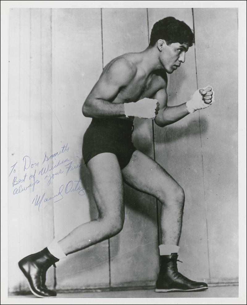 American boxer (1916-1970) of the 1940s who was inducted into the International Boxing Hall of Fame in 1996. Glossy 8 x 10 photo, signed and inscribed in blue ballpoint “To Don Smith, Best of wishes always, your friend, Manuel Ortiz.” In fine condition, with some light surface marks and a few corner tip creases. Accompanied by a certificate of authenticity from PSA/DNA.