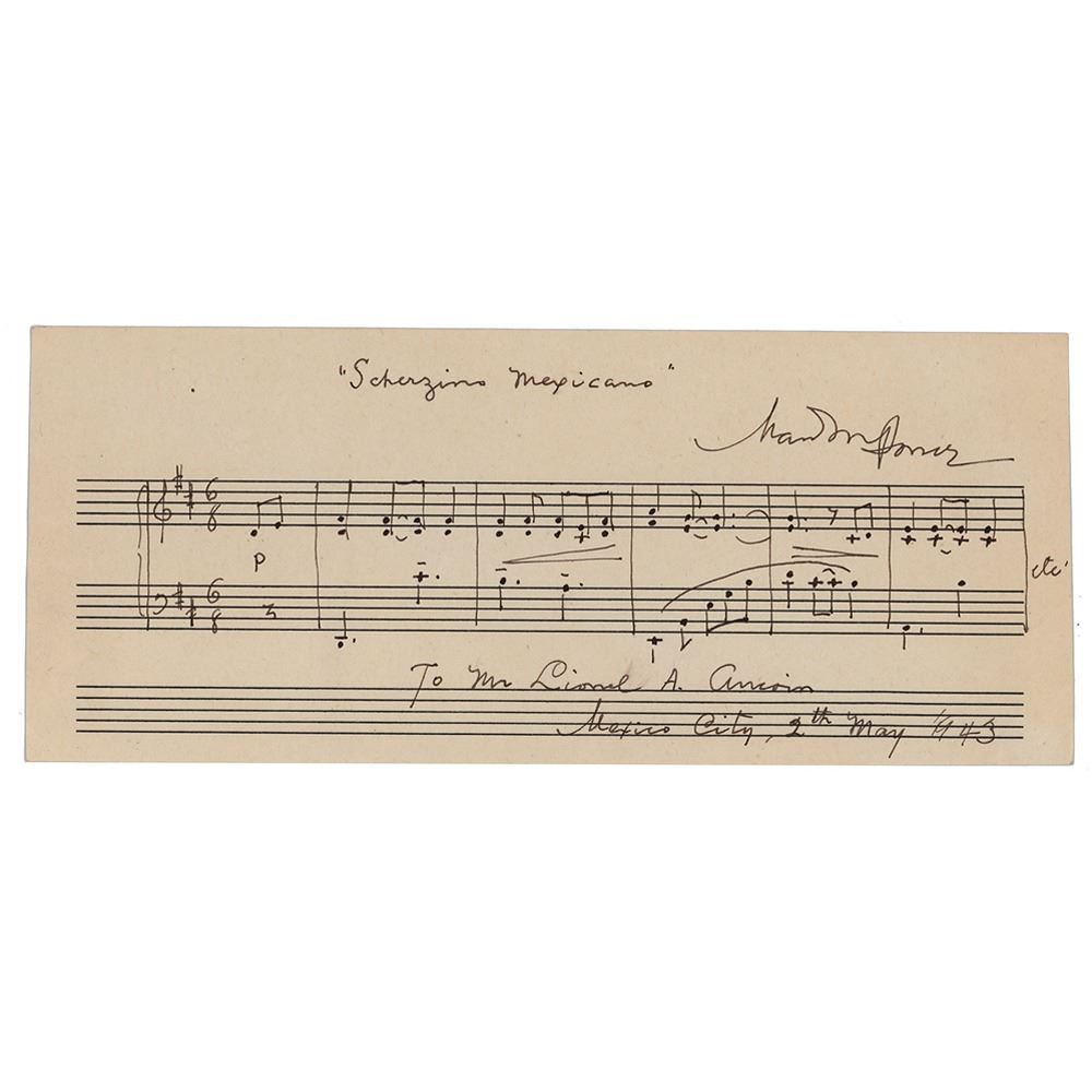 Mexican composer, music educator, and scholar (1882–1948) whose work connected the concert scene with a mostly forgotten tradition of popular song and Mexican folklore. Many of his compositions are strongly influenced by the harmonies and form of traditional songs. Scarce AMQS on an off-white 9 x 3.75 musically lined sheet, signed and inscribed in fountain pen, “Manuel Ponce, To Mr. Lionel A. Aucoin, Mexico City, 2 May 1943,” who adds 12 bars of music from his composition, “Scherzino Mexicano.” In very fine condition.