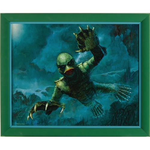 <B>Manuel Sanjulian - "Creature From the Black Lagoon" Painting Original Art (undated).</B></I> As the character Lucas put it, "I can tell you something about this place. The boys around here call it 'The Black Lagoon' -- a paradise. Only they say nobody has ever come back to prove it. There are many strange legends in the Amazon. Even I, Lucas, have heard the legend of a man-fish." Manuel Sanjulian showcases the "Gill-Man" in all his glory, in this fabulous full-color underwater scene. Based on the Jack Arnold/Universal International Pictures movie classic, this canvas captures the sublime terror of the chilling vision created by Olympic swimmer/stuntman Ricou Browning knifing through the water, outfitted in Milicent Patrick's costume (said to have been based on old seventeenth-century woodcuts of two bizarre creatures called the Sea Monk and the Sea Bishop). This painting is so faithful to the film, you can practically hear the Creature's signature theme music in your mind -- the brassy, bombastic, three-note progression of <I>da da daaaaa</B></I>! The overall size of this framed canvas measures approximately 33" x 27", and the art is in Excellent condition.<BR><BR><b>Shipping:</b> Framed (<a target="_blank" href="http://www.heritageauctions.com/common/shipping.php">view shipping information</a>)