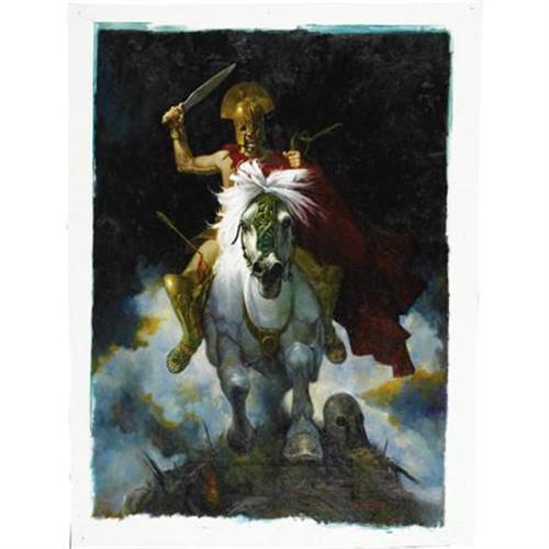 <B>Manuel Sanjulian - "Roman Centurion" Painting Original Art (undated).</B></I> In the ancient world few sights were more breathtaking than a Roman Centurion on horseback, riding at a full gallop. Rendered in glowing, atmospheric tones of warm and cool hues, this electrifying scene is the work of a true modern master of fantasy art. This unstretched oil on canvas piece has an overall size of 41" x 54", and is in Excellent condition. <BR><BR><b>Shipping:</b> Rolled Material (<a target="_blank" href="http://www.heritageauctions.com/common/shipping.php">view shipping information</a>)