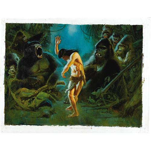 <B>Manuel Sanjulian - "Tarzan at the Dum-Dum" Painting Original Art (undated). </B></I> The feverish ecstasy of the "Dum-Dum" (or dance of the great apes) from the <B>Tarzan</B></I> novels is brought to life thanks to Manuel Sanjulian's remarkable mastery of human and animal anatomy. As Edgar Rice Burroughs wrote in <B>Tarzan of the Apes</B></I>, the Dum-Dum "marked important events in the life of the tribe -- a victory, the capture of a prisoner, the killing of some large fierce denizen of the jungle, the death or accession of a king, and were conducted with set ceremonialism." Sanjulian is a modern master in the field of painted fantasy art and this version of the famous ape dance is sure to be a welcome addition to any Tarzan fan's collection. The overall size of this unstretched canvas measures approximately 53" x 41", and the art is in Excellent condition.<BR><BR><b>Shipping:</b> Rolled Material (<a target="_blank" href="http://www.heritageauctions.com/common/shipping.php">view shipping information</a>)