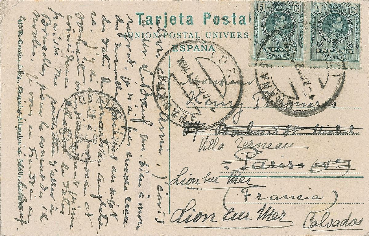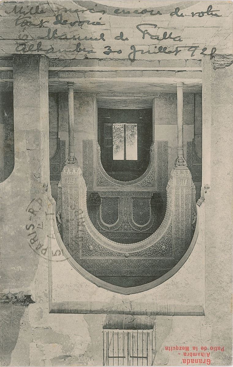 Important Spanish composer (1876–1946) who takes a place among the most distinguished figures in twentieth-century music. ALS in French, one page on both sides of a 3.5 x 5.5 postcard showing the Alhambra in Granada, July 30, 1920. Letter to his publisher Henri Prunieres, founder of La revue musicale, in part (translated): "Precise dates for the concerts in England…relatively close together...will permit me to go to Brussels for the concert on November 12….Again one thousand thanks.” Signed upside down on the front of the postcard. In fine condition. At this time de Falla was living in the Pension Alhambra in Granada, a city closely associated with him and his friend Federico Garcia Lorca. In May of 1921 he triumphed at London’s Queens Hall playing the piano part of his ‘Nights in the Gardens of Spain.’ A wonderful association piece.
