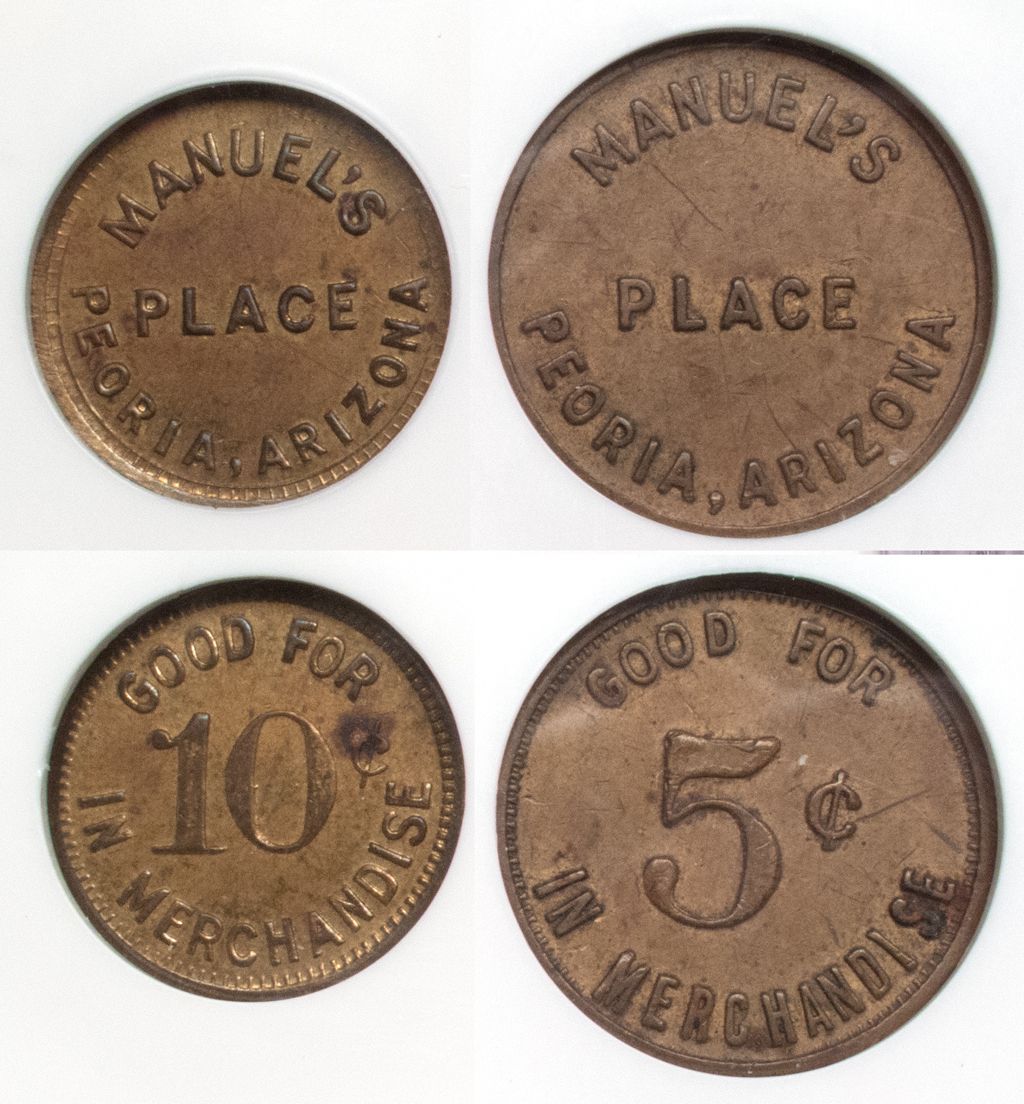 1) Manuel's Place / Peoria, Arizona, GF 10c Im Merchandise. Circa 1910. MS 60. 2) Manuel's Place / Peoria, Arizona // GF 5c IM / Circa 1940's or 1950's. AU 55.City: PeoriaCounty: MaricopaState: AZDate: