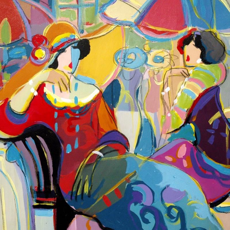 "Manuela Y Sofi" is an original acrylic painting on paper by Isaac Maimon, hand signed by the artist. Includes Certificate of Authenticity. Measures approx. 30" x 24" (image).