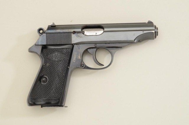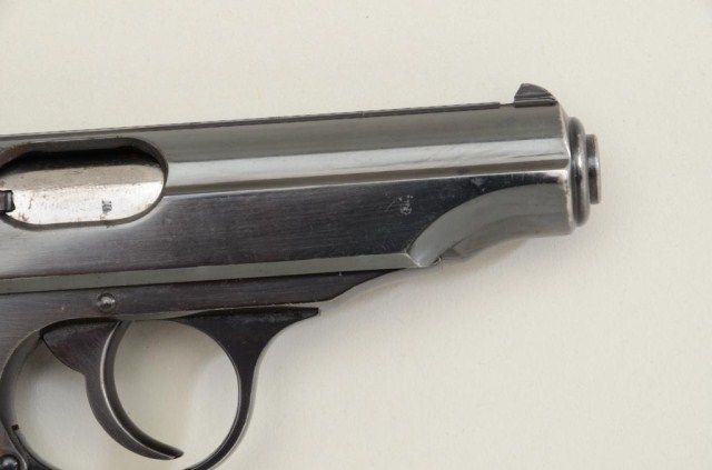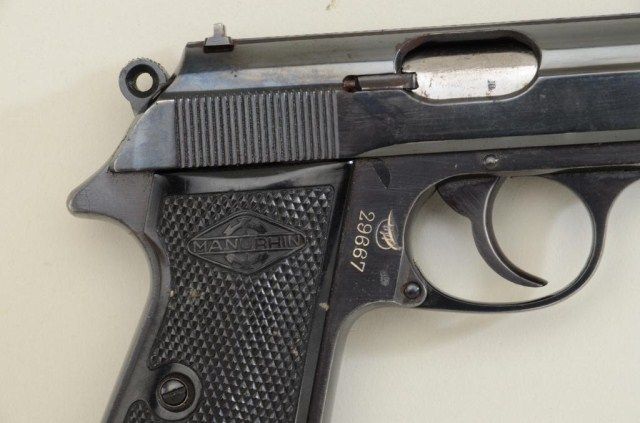 Manurhin PP on Walther License, 32 semi-auto 29667 showing North European (Scandinavian) proofed with Kristin Chamn Dealers name on tgt and box. Very good used condition, 80-90% finish, normal wear and use. Goodbore, good overall. Est.:$300-$600.