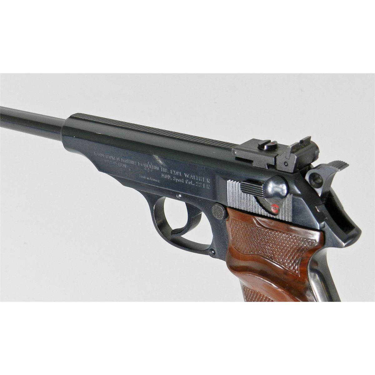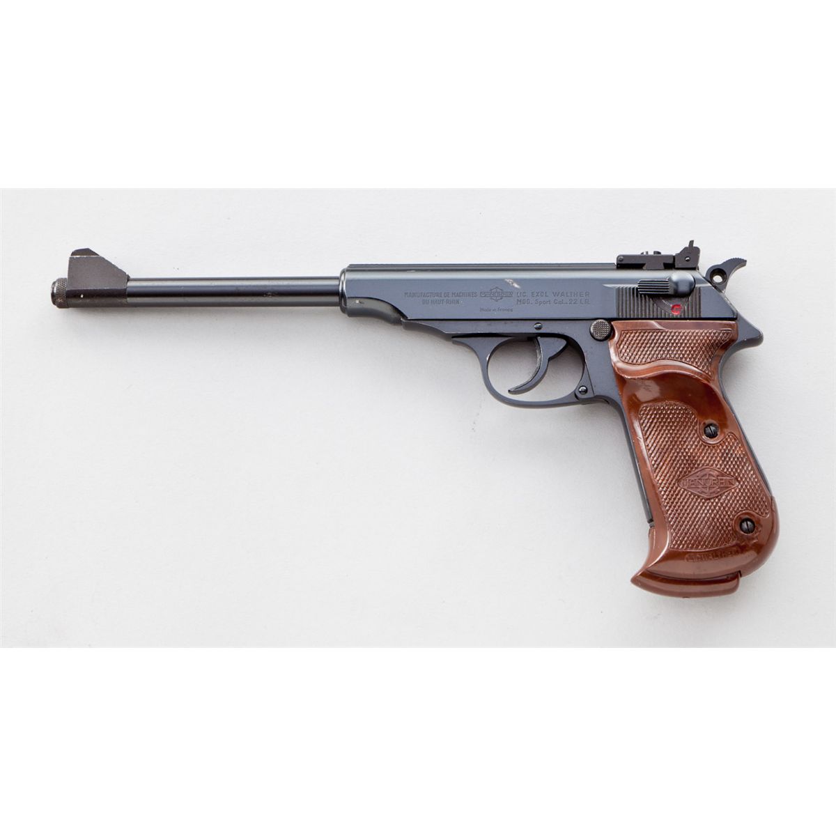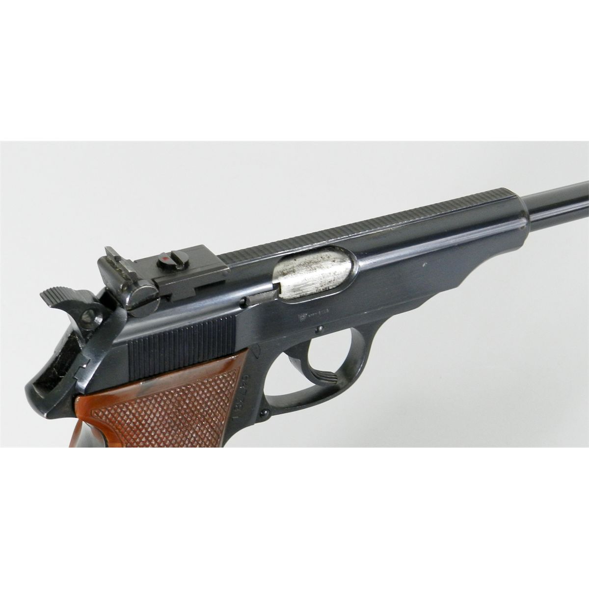 Manurhin Sportmodel Semi-Automatic Target Pistol, #64738L, .22 LR cal., 8'' barrel, blue finish, thumbrest brown checkered plastic grip with Manurhin logo. Mfg'd under license from Walther, these French-made target pistols are known for their accuracy and reliability. Single Action only. Condition is fine retaining approx. 96% original factory blue with small scuffs to finish. Grips with mild flattening. Action is crisp, bore is bright, with one correct magazine. Est.: $500-$750.